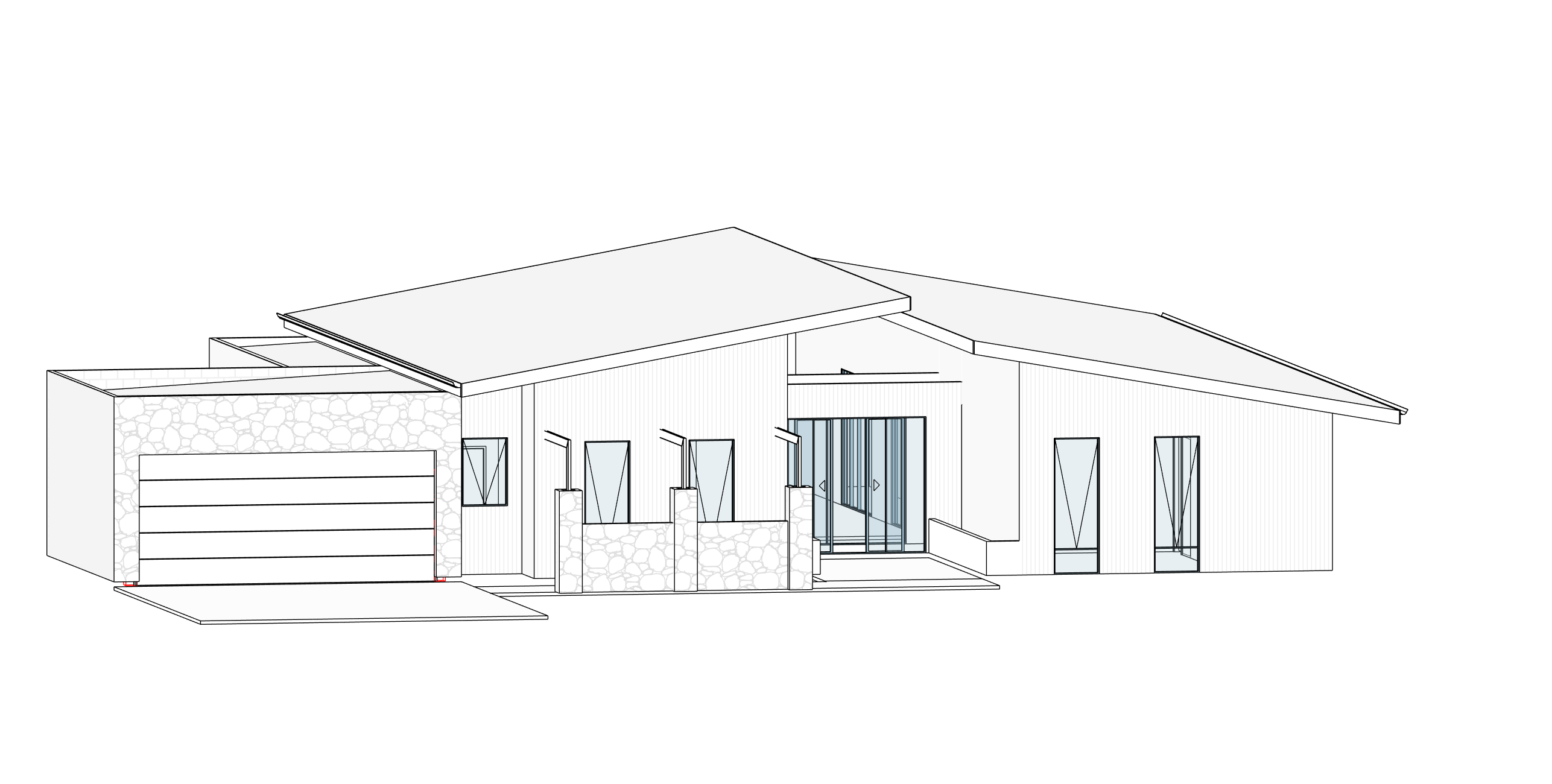 shou sugi ban cladding black to the house and stone cladding to the garage on the left and stone cladding on the boundary walls infront