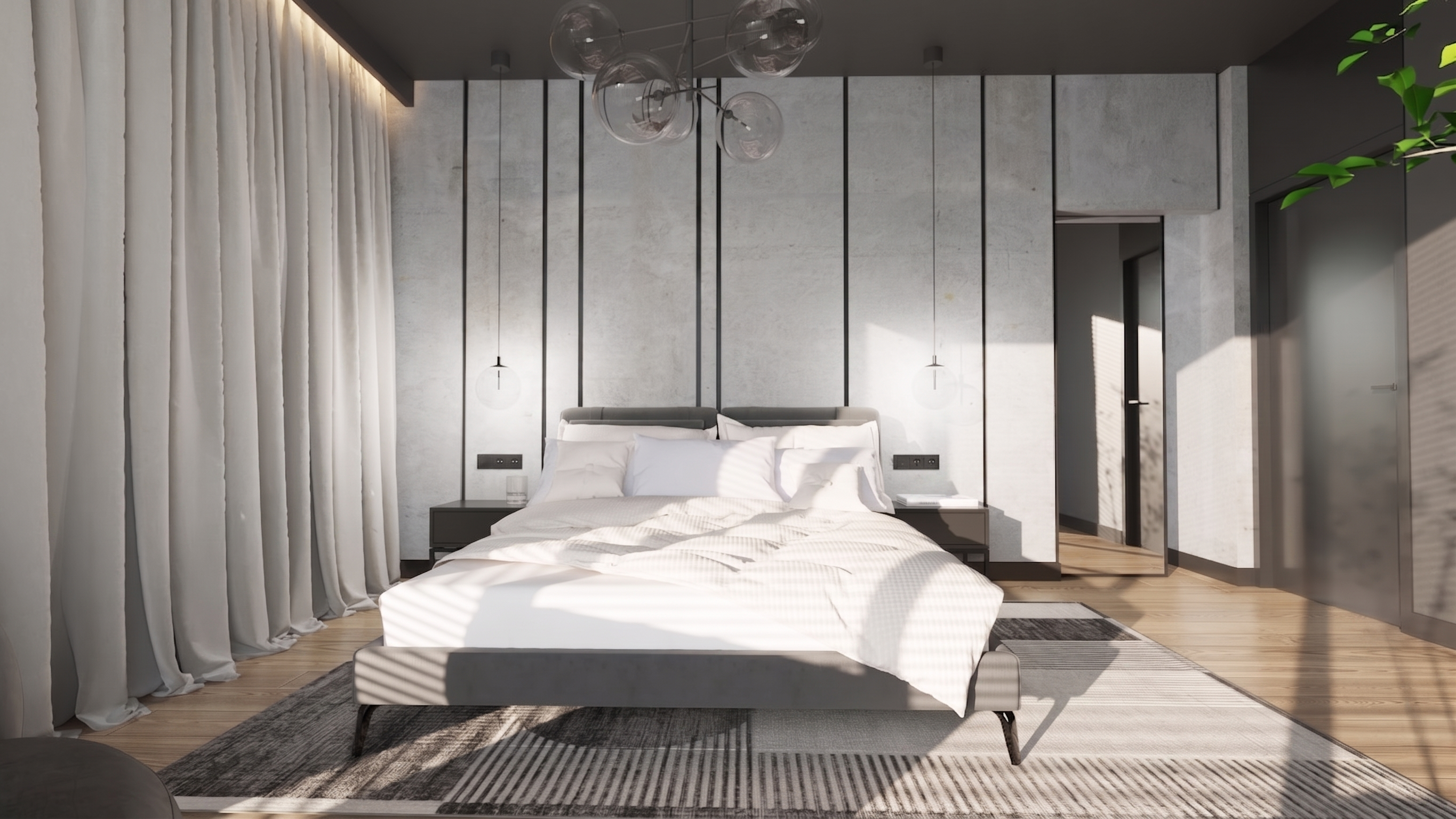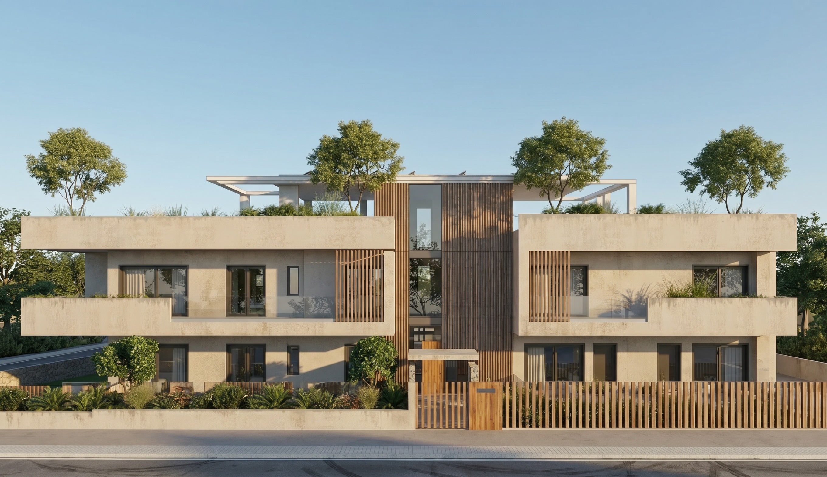 modern white residential building with clean minimalist geometry featuring natural wooden elements on fa ades and balconies large glass openings soft natural lighting mediterranean atmosphere high detail realistic materials architectural visualization wide angle view soft shadows contemporary design