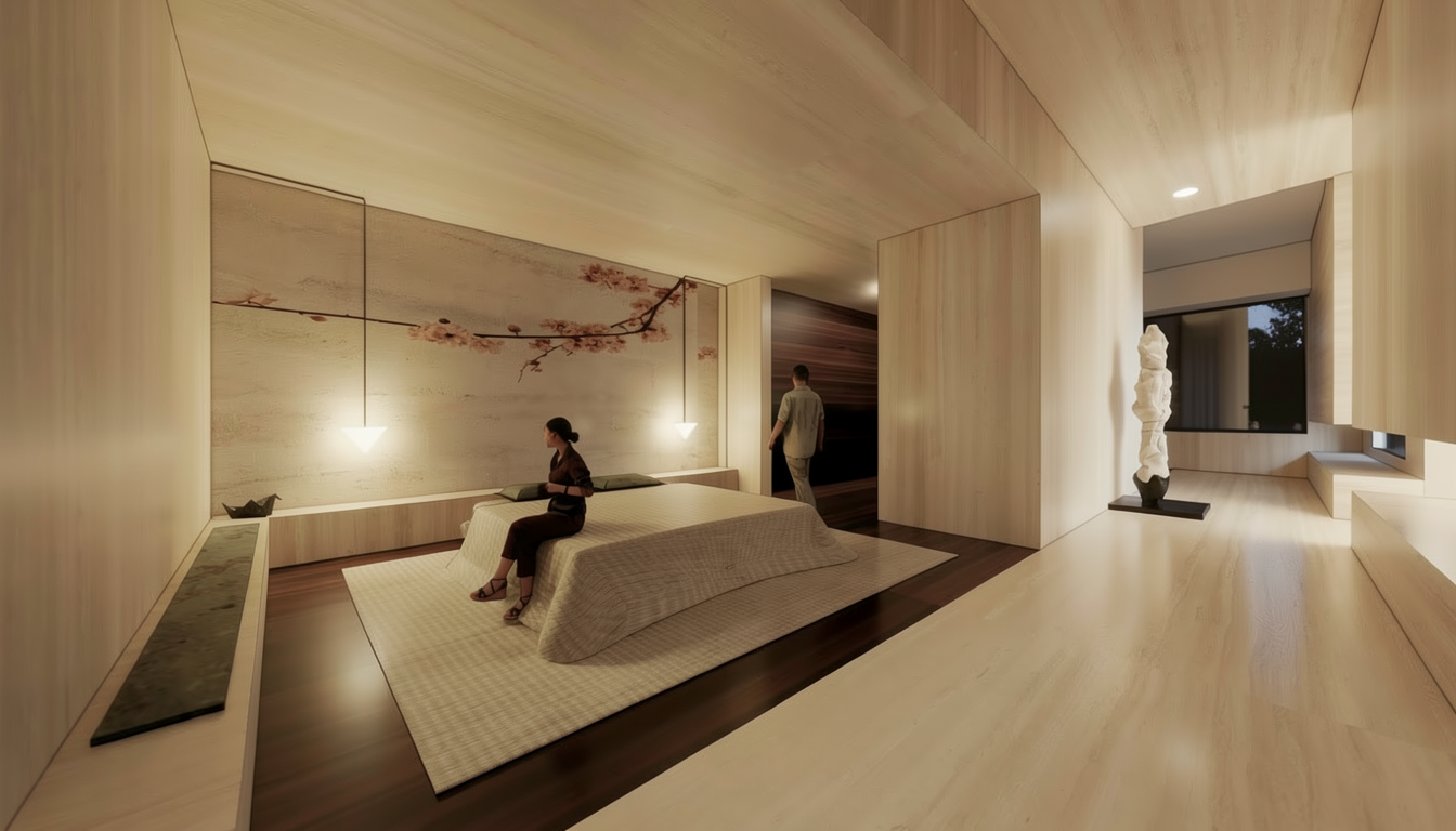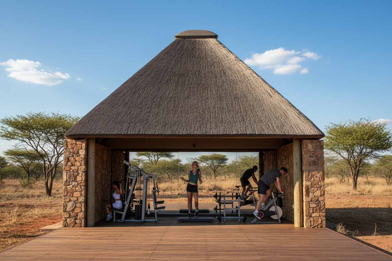 thatch roof gym in the bushveld with a timber deck in front the front columns are timber the rear are stone rubber mat internal floor