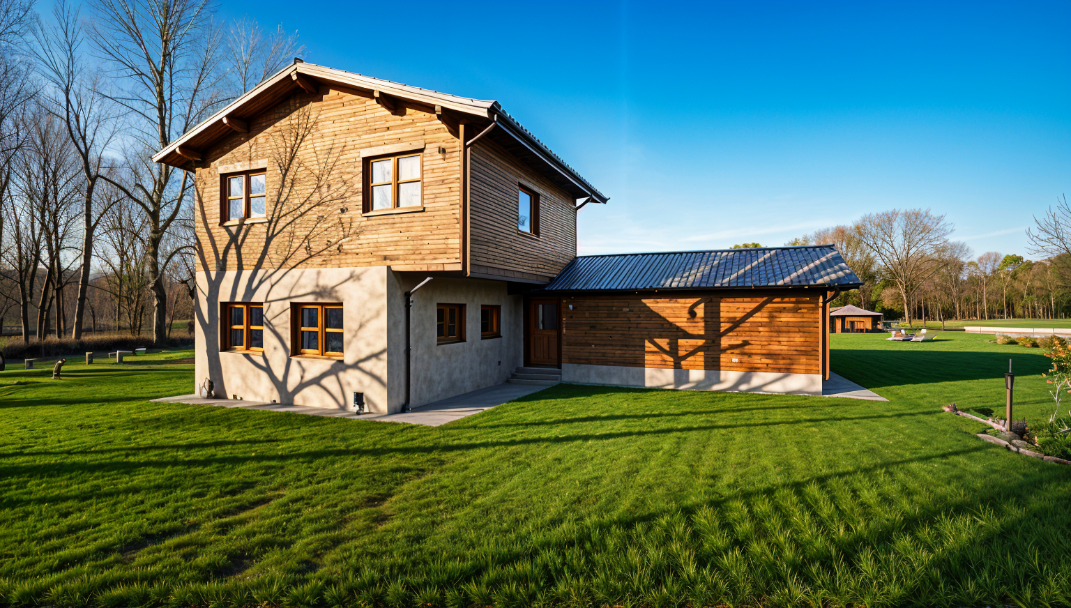 photorealistic render exterior view modern residence with white stucco walls dark blue metal roof with dark blue trim windows with black frames stained wood garage door surrounded by massive forest fire