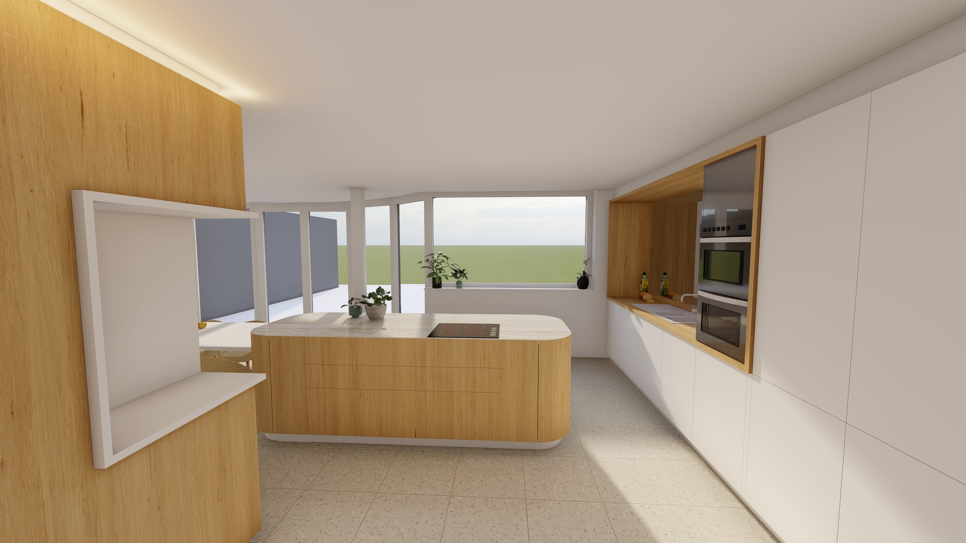transform the provided contemporary kitchen interior image into a high end hyper photorealistic render with clear natural midday lighting as if the sun is high in the sky producing defined yet soft shadows strictly preserve the exact same proportions geometry layout volumes ceiling height openings furniture placement spatial configuration and camera angle do not modify the architectural structure the shape of the island the alignment of the cabinetry the wood niche the window dimensions the cylindrical column or the precise positioning of any element the monolithic island must retain its exact dimensions and form the marble effect stone surface should display enhanced realism with natural beige and warm ochre veining that has visual depth and subtle tonal variation the surface finish should appear softly polished with gentle reflections of the sky and interior environment avoiding excessive gloss while maintaining a premium mineral appearance the white handleless cabinetry must remain identical in placement and proportion but appear as high quality matte lacquer with very subtle micro texture that interacts delicately with the lateral daylight edges should remain crisp and clean the integrated wood niche must preserve its exact framing and proportions while revealing a rich natural wood grain with slight organic tonal variations the finish should appear satin with soft internal shadowing in corners to enhance depth the integrated oven and microwave must appear realistic with refined stainless steel reflections subtle environmental reflections in the glass accurate material depth and premium detailing the terrazzo effect light floor tiles must retain their layout and scale while presenting believable mineral grain fine chromatic variation realistic grout joints and very soft diffuse reflections from daylight the transition toward the wooden flooring in the adjacent living area must remain identical while the parquet exhibits authentic wood grain natural tonal shifts and a soft satin finish all chairs around the island must remain in their exact positions and proportions their wooden surfaces should appear more realistic with refined grain texture subtle light interaction and slight natural edge softness without altering their shape the decorative elements on the island including the cups and the apple must appear fully photorealistic the ceramic should have a subtle glaze reflection the coffee surface should display realistic liquid depth and soft reflection the apple should show natural skin variation organic color shifts and a delicate highlight lighting must simulate true midday natural daylight entering through the large windows shadows should be defined yet softened by interior bounce light the light temperature should remain neutral to slightly warm but not golden subtle reflections should appear on the stone island surface and cabinetry contact shadows should enhance realism while preserving a clean architectural photography aesthetic replace the current exterior background with a photorealistic landscape consisting of a natural green meadow extending toward the horizon with a few scattered trees placed along the skyline the sky should be clear blue with slight atmospheric depth and a very subtle haze near the horizon the sunlight direction must remain perfectly coherent with the interior shadows the landscape must be visible through all windows without altering their dimensions proportions or alignment the final image should resemble a professional architectural photograph captured with a full frame camera and a 24 to 28 mm lens the render should feature balanced exposure natural dynamic range refined contrast precise edge definition rich material texture subtle micro shadows and realistic light behavior avoid artificial glow overexposure or exaggerated post processing effects the entire scene must remain identical to the original in structure composition and spatial organization while achieving luxurious hyper realistic photographic quality