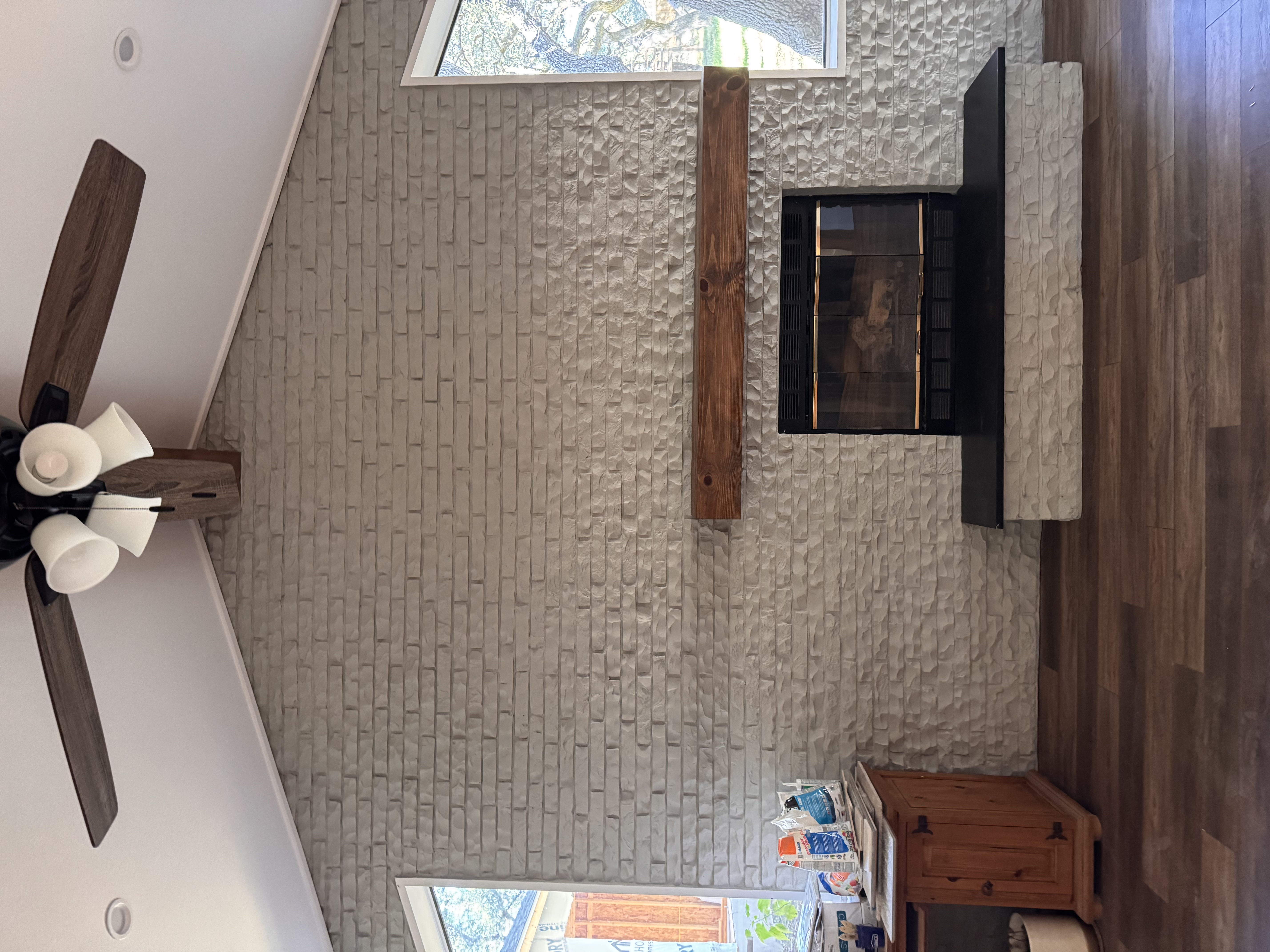 can you create a spanish style fireplace we won t change the wall stone or color we need to keep the firebox off center we want to change the mantel and the hearth to look more modern on a spanish style we would like to create a niche on the left side with a contraste back finish and wood shelving