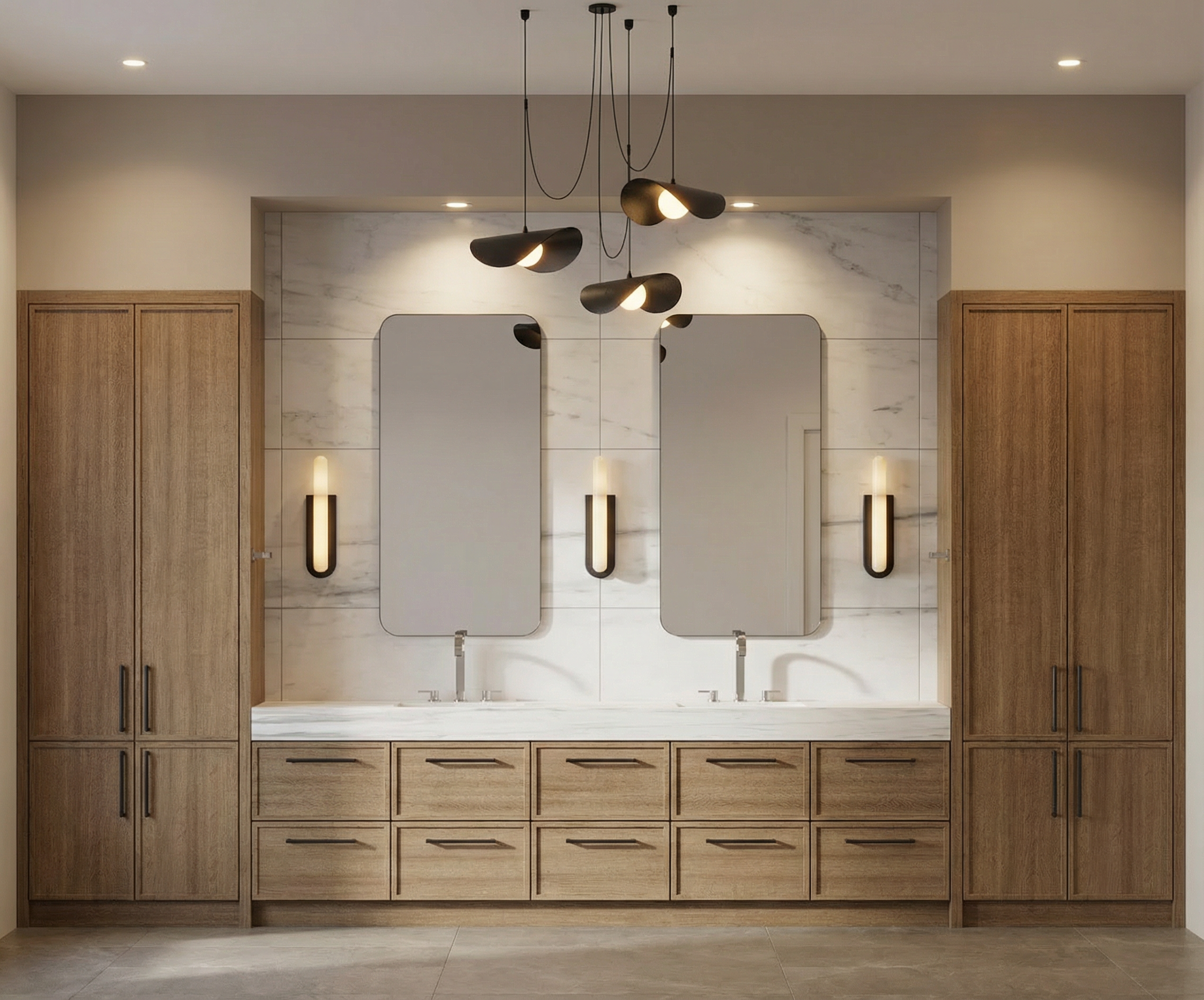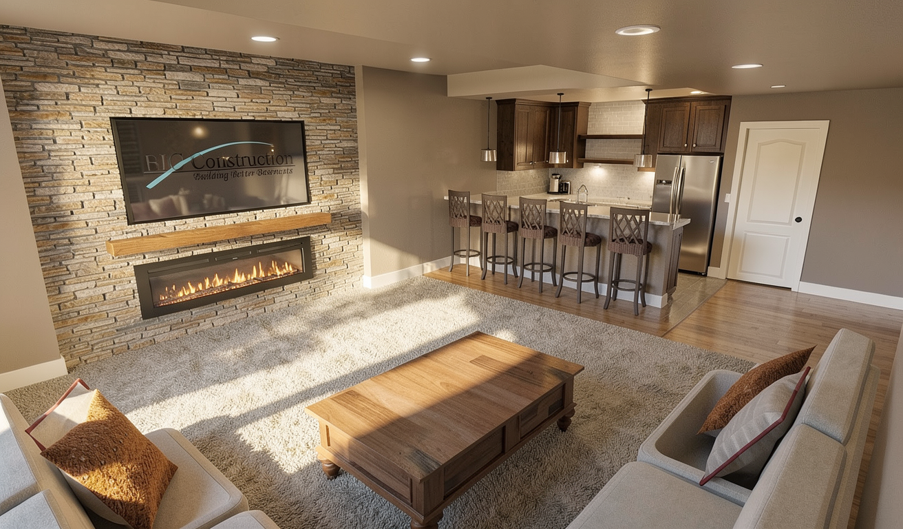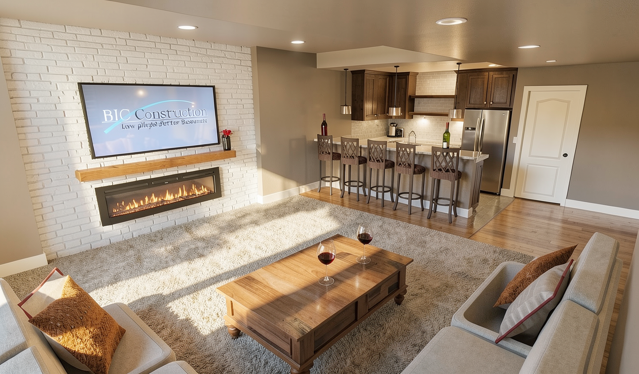 change the black lettering on the tv bic construction building better basements with the light blue swipe through it to white lettering make the carpet low pile pattern and add some light additional furnishings and show only two wine glasses and a bottle of wine on the bar top change the stone behind the tv to white shiplap