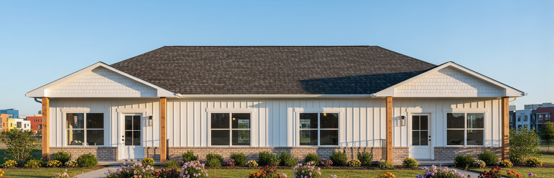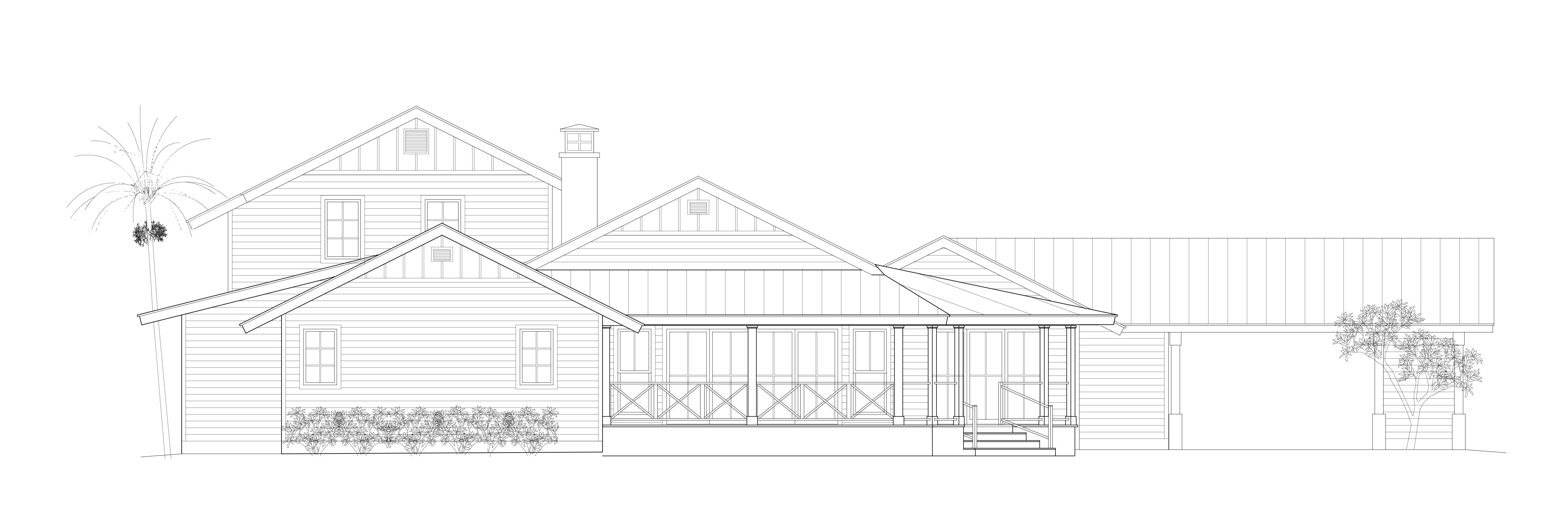 generate a beautiful realistic architectural rendering key west style tropical florida lush landscaping white and light blue siding white windows and trim screened porch metal roof pool in foreground white chimney