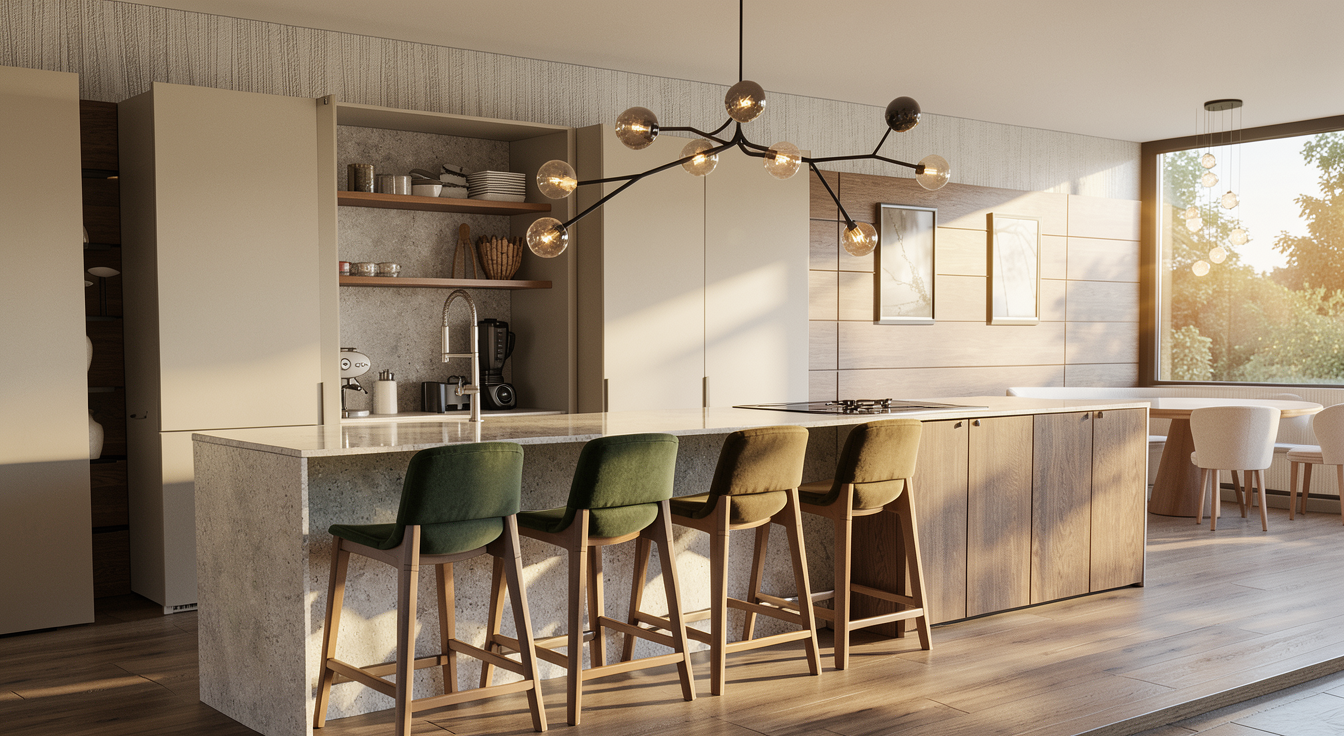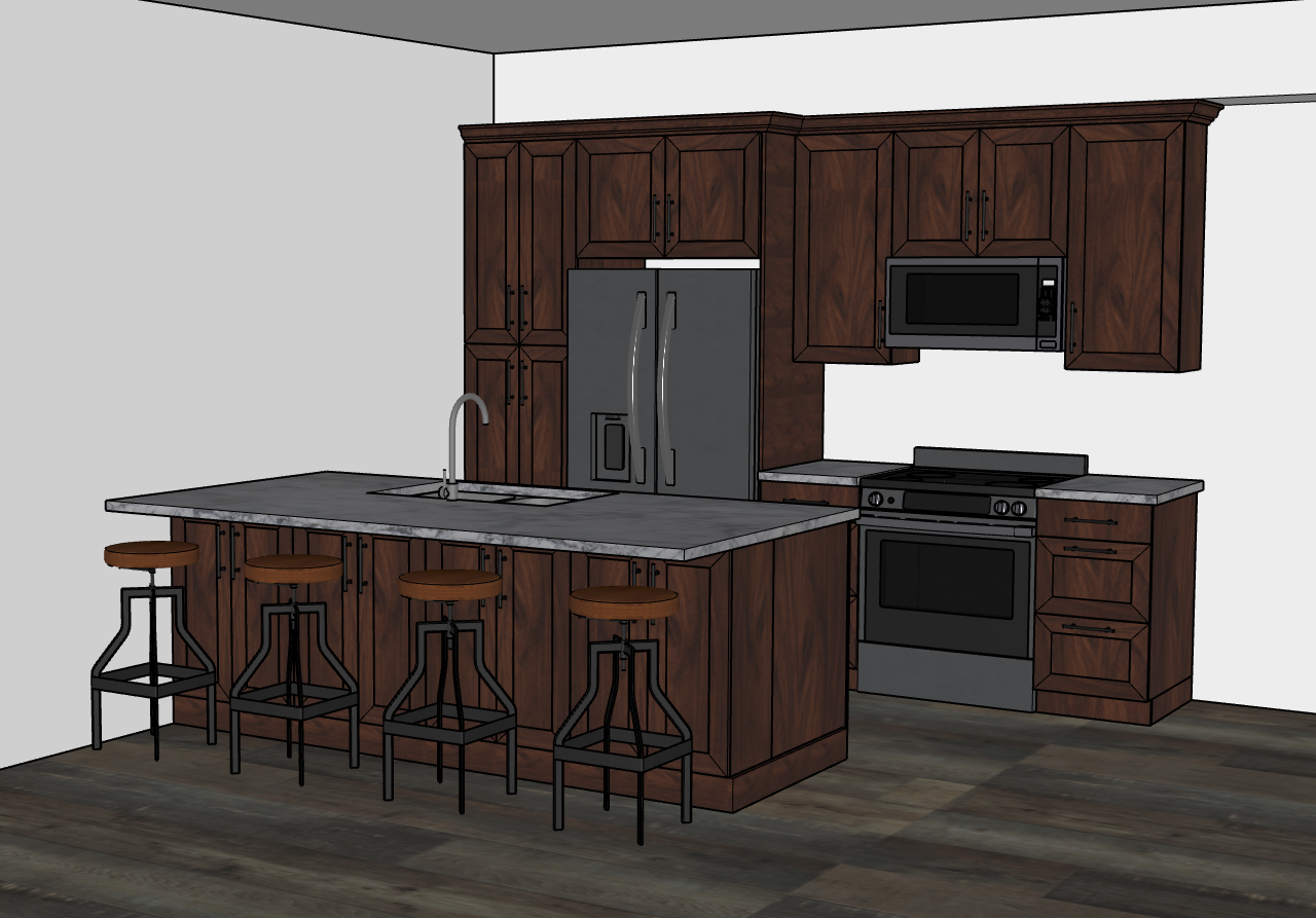 this is a beautiful kitchen with cabinets made of natural stained walnut the handles are all a matt black all appliances are a modern stainless steel the countertops are a beautiful white marble the flooring is a nice modern medium light rustic lvp flooring this kitchen has lots of natural light coming in from behind the camera add pendant lights over the island to make it more cozy
