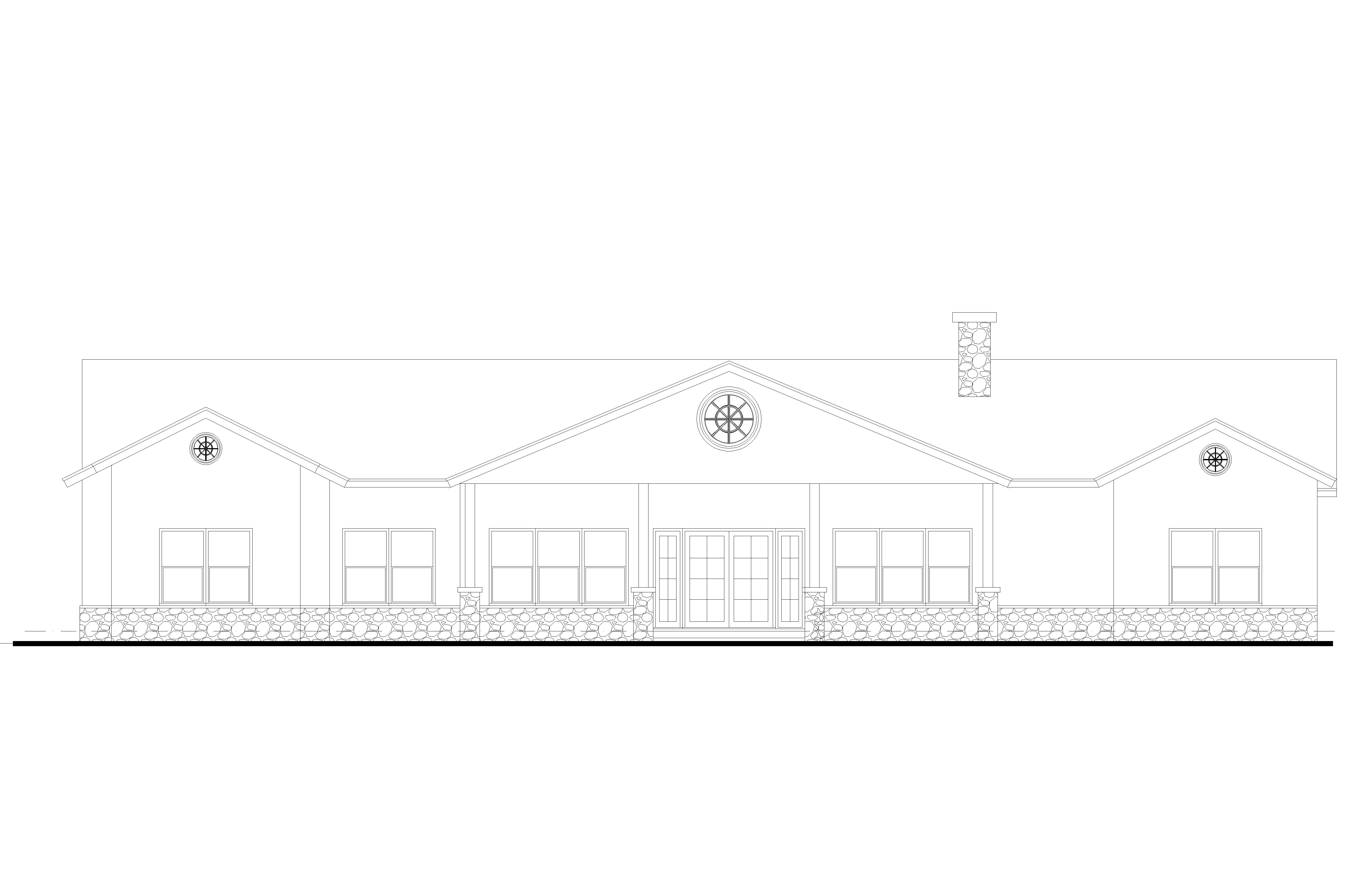 this is a front elevation of a house pearl stucco exterior walls metal black roof black aluminum window frames black mahogany porch columns and black main entrance doors grey natural stone cladding with clean stone bands at the top and bottom of the facade balanced modern composition soft blended landscaping green grass subtle plants clean outdoor environment natural daylight convert this image into realistic render