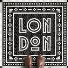 render a detailed mosaic floor with a central design reading london in bold geometric white letters surround the text with a border featuring intricate black and white patterns creating a classic and stylish visual the floor should convey an elegant and timeless atmosphere in the foreground include the tips of brown leather shoes facing the text adding a personal touch and depth to the image