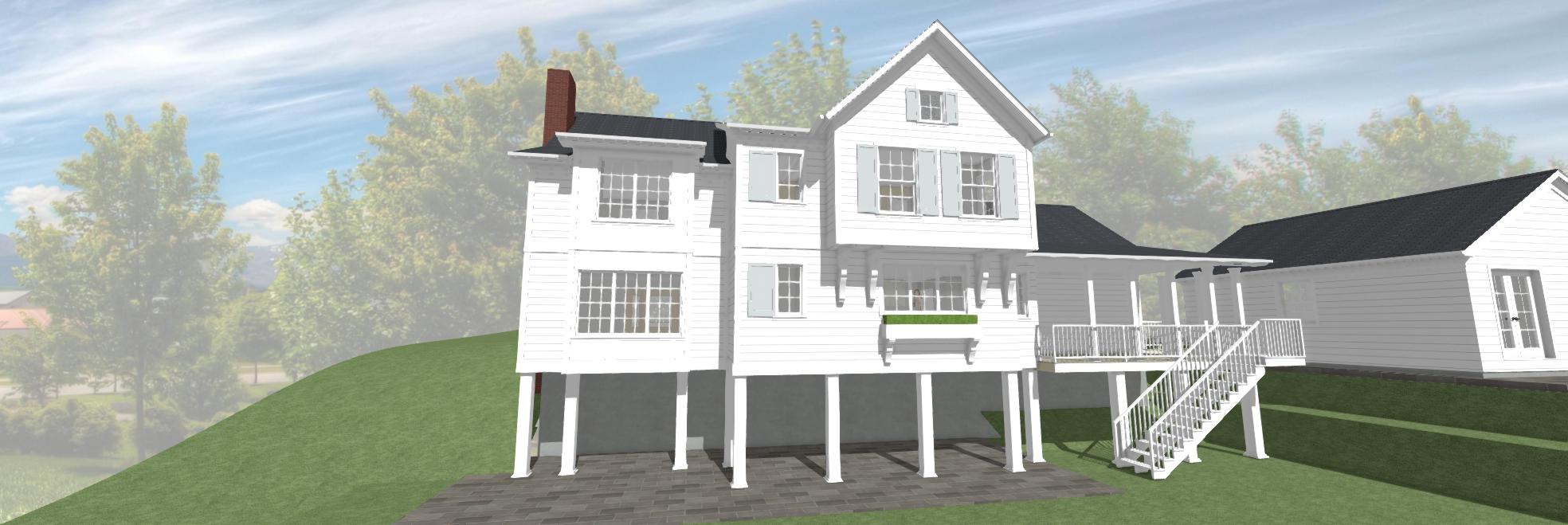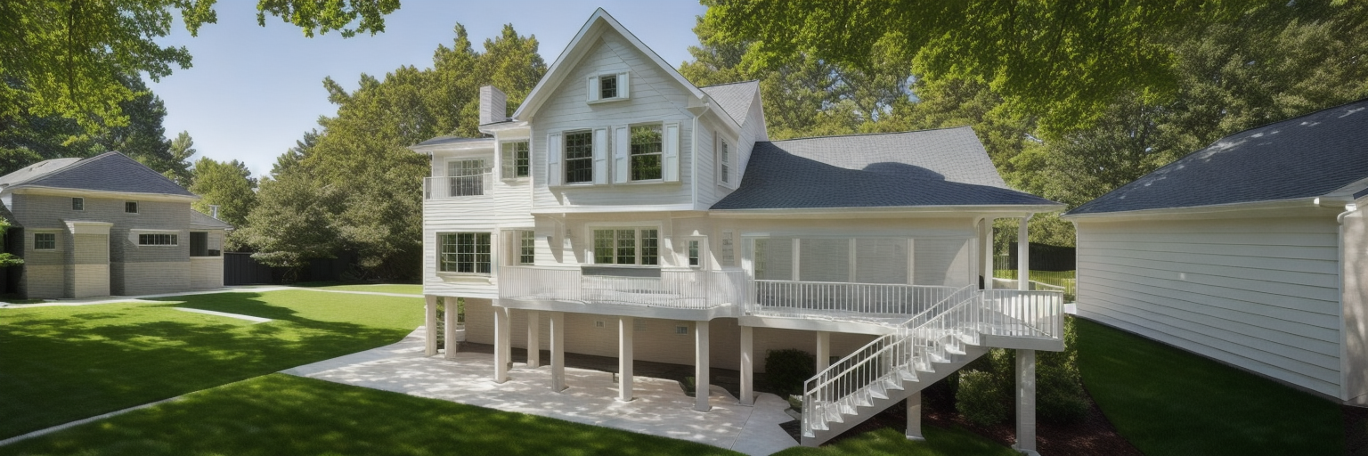 colonial revival exterior shot suburban rear elevation design with trees and a clear sky in the background dark shutters and a white house grass backyard with a garden and fencing architecture