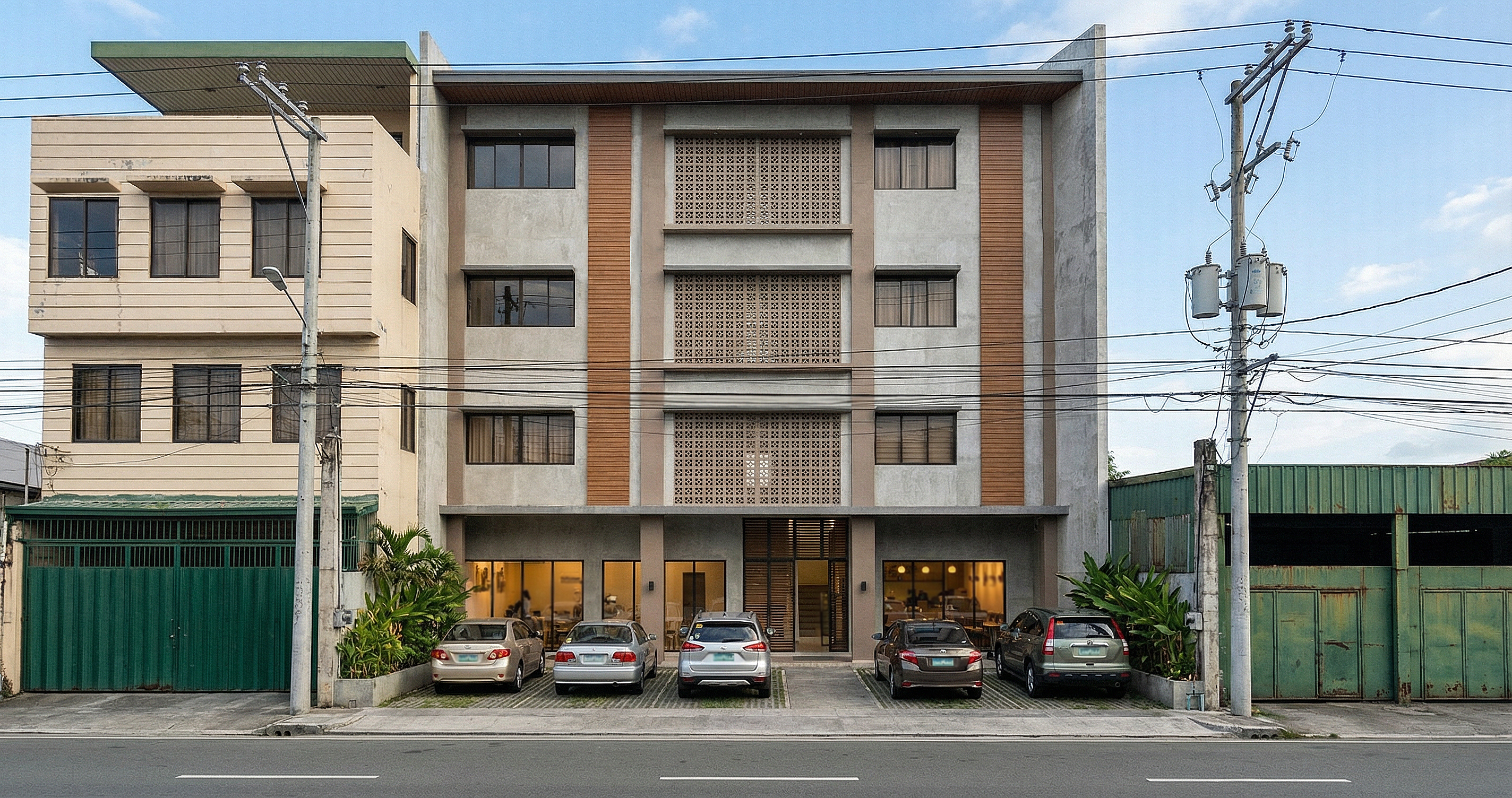 make a night view render add in lights at the window canopies focus on the building in the middle only add lights at the roof canopy make the inside rooms bright do not add roof lights on the building on the left