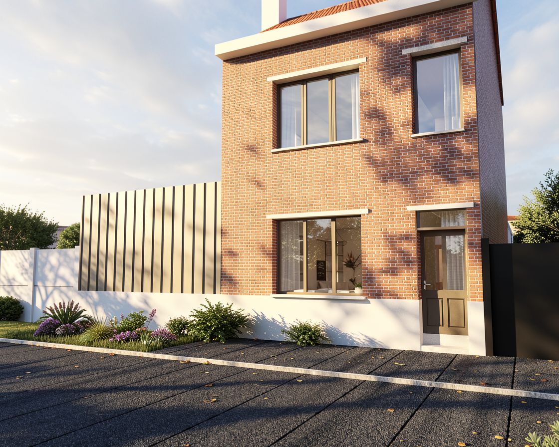 interior shot render a modern minimalist kitchen with a clean and open atmosphere use light american walnut textures for cabinets and island with sleek marble countertops in subtle cream with little veining incorporate dark gray metal for the minimalistic barstools and kitchen fixtures add a potted green plant on the left side for a touch of nature the walls and floor should be a warm white to enhance the spacious feel include a large window on the right with soft natural light streaming in keep the overall ambiance calm and airy with a hint of contemporary elegance