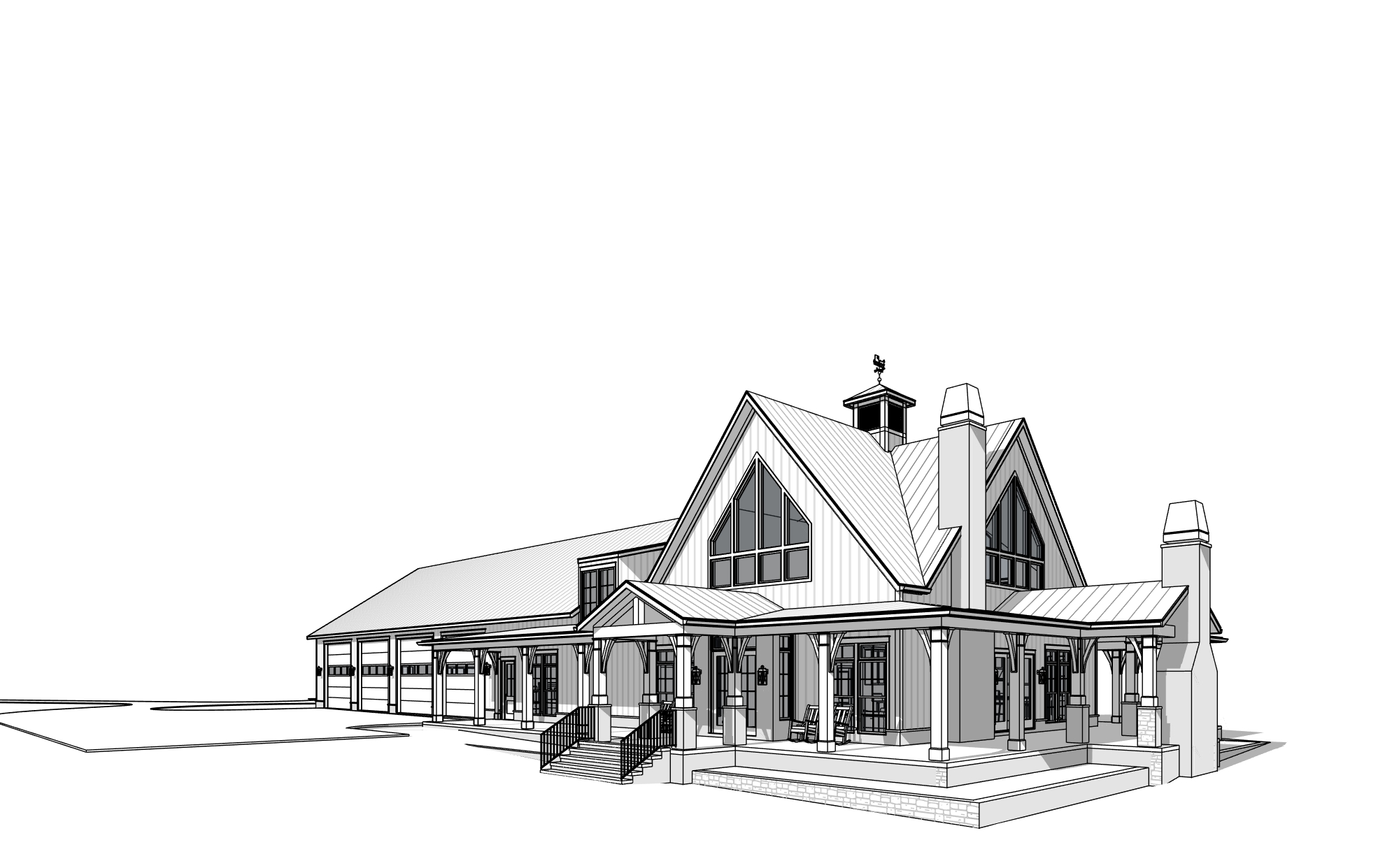 create a scene using the image of a farmhouse the house has white painted board and batten siding with a grey stone base and chimneys the chimney caps are aged copper the windows are painted black the columns and timber elements are stained walnut the roof is black standing seam metal include low landscaping around the porch with landscape lighting the interior should be lit the scene occurs just before dusk in the evening the garage doors are painted black create a paver sidewalk connecting the driveway to the stairs at the entrance add grass to the yard on the lower right side of the image the roof trim should be black
