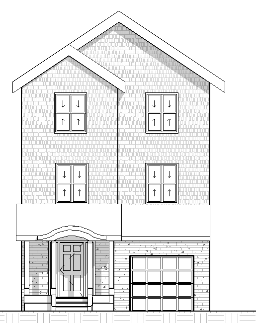 create a front elevation photorealistic image for this townhomes bay head shingle style in white with black accents window frames trimming and roof the roof should have a greek return
