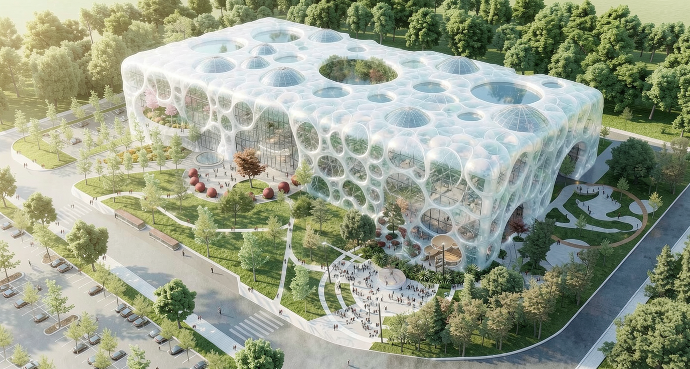 do not change any existing geometry create an architectural plan drawing of the site around my building the blue color that is on the left hand side of the image is meant to be water in the form a river the building is the white square with the white rectangles around it do not change the building in any way the pink shape in the top right corner needs to be four existing pickleball courts that run the length of the rectangle do not put the pickleball courts anywhere but the pink shape place a small parking lot in between the pink shape and the white building add any landscaping to make the parking lot look appealing the purple material is meant to be the asphalt of the street do not change the shape of the existing street add access from the parking lot to the street the green areas are medians in between the road where there needs to be some trees and other plants the remaining central gray portion needs to be turned into a cool park with an outdoor classroom