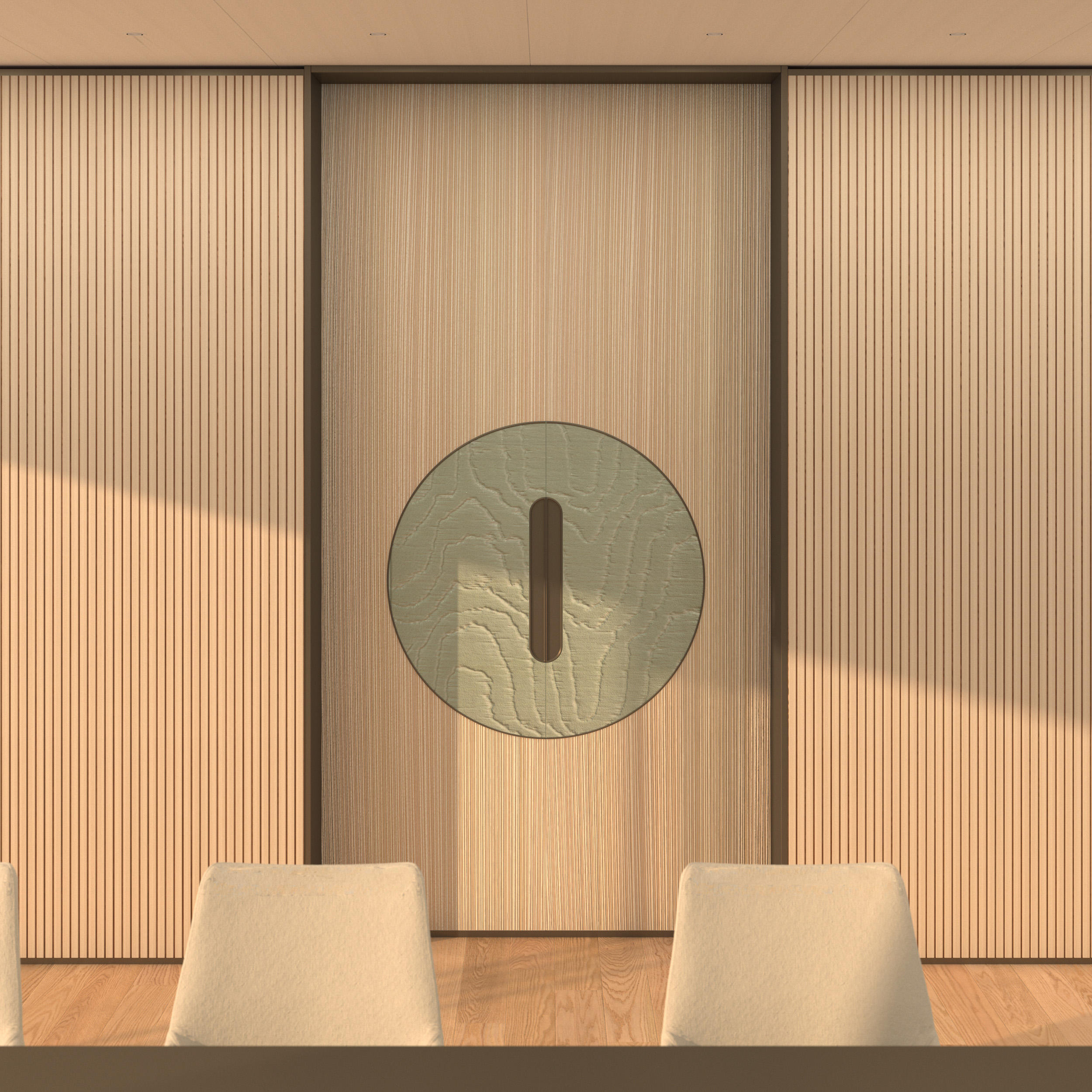 add two symmetrical minimalist chinese inspired bronze totems placed on both sides of the central door the totems should be tall and slender approximately 1 4 1 6 meters sculptural brushed dark bronze finish with subtle warm undertones matte surface soft realistic reflections clean geometric silhouette refined proportions minimal detailing inspired by ancient chinese bronze geometry some engraving may remind to the li brocade roundish shapes very thin slender and elegant the totems must be perfectly aligned and symmetrically positioned against the wooden slat wall maintaining architectural balance do not modify anything else in the scene keep the lighting materials camera angle composition colors textures and all existing elements exactly as they are no changes to exposure contrast shadows furniture wall panels flooring or artwork only add the two bronze totems high realism physically accurate materials natural integration with existing light subtle shadows cast on the wall architectural visualization quality