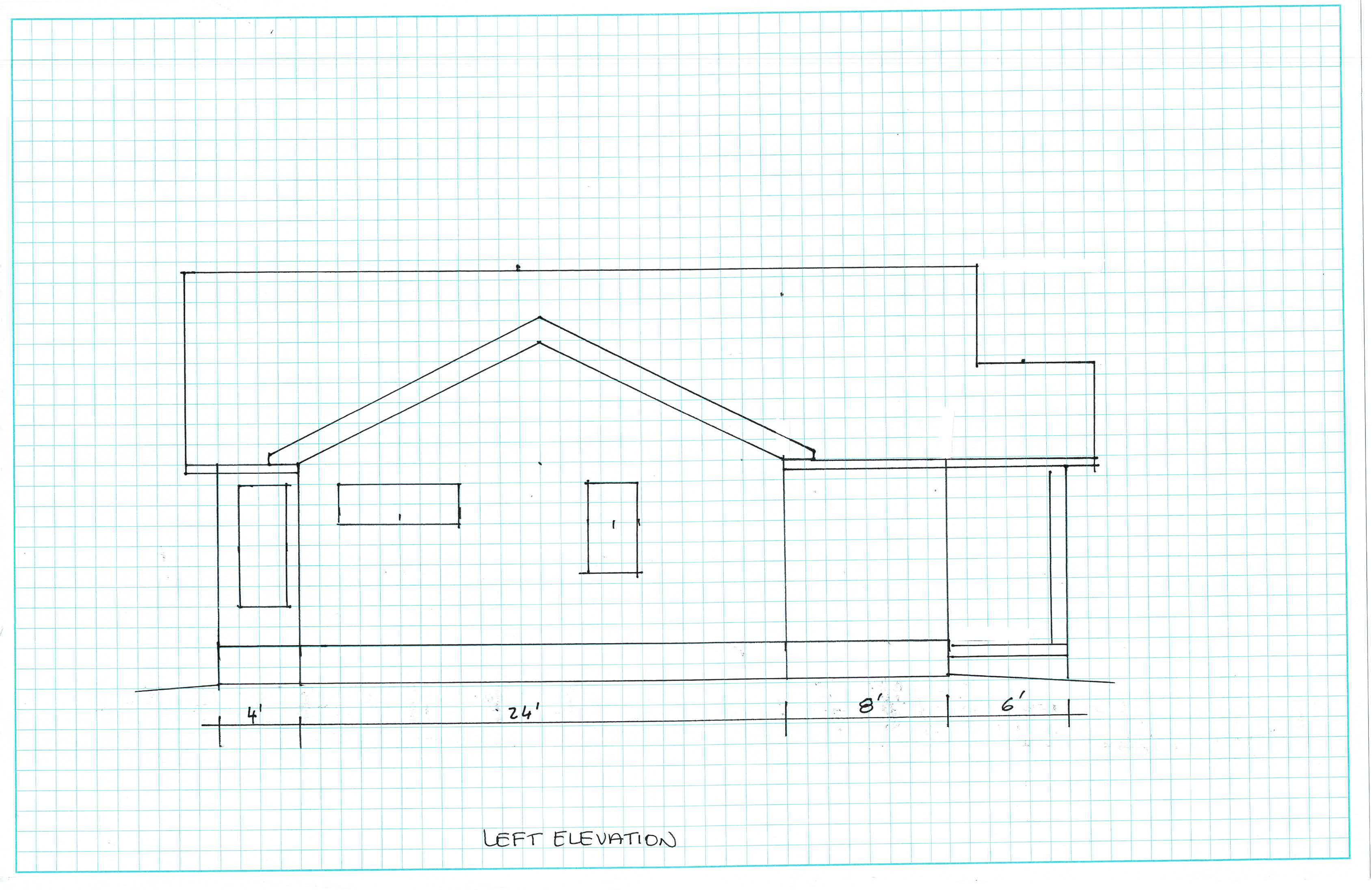 create a 2d image of the elevation from the left side elevation sketch use charcoal color lap siding with black windows