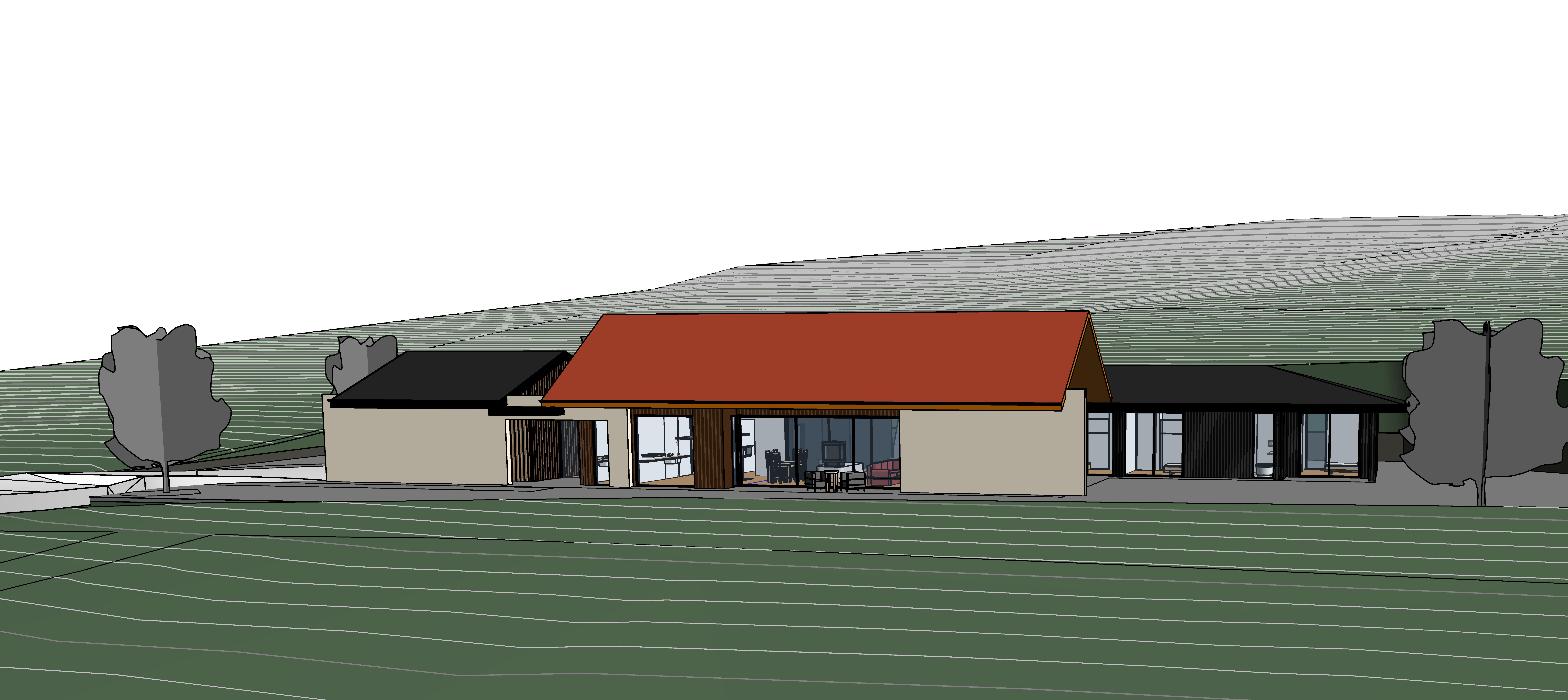 sunny day minimal cloud corten cladding main building surrounding pavilions are black roof and cladding