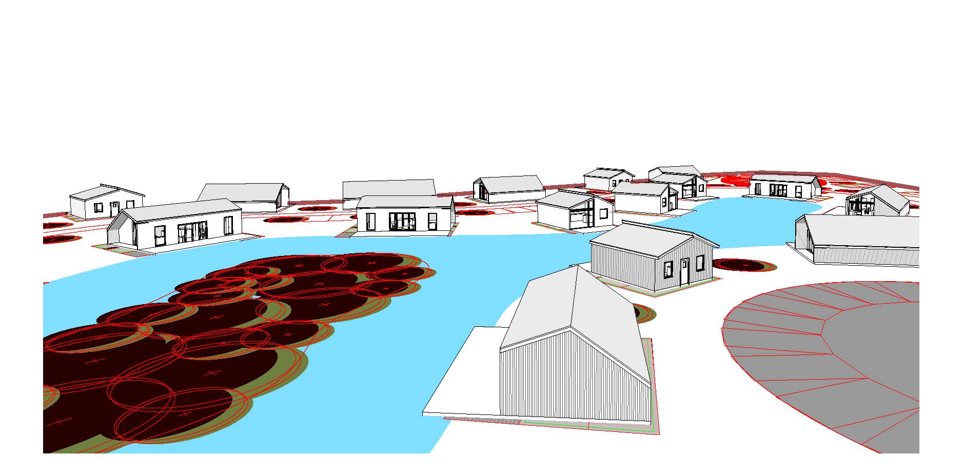 create a picturesque architectural render of lakeside lodges the lodges are timber clad in light natural wood tones the lodges have a terrace which sits on top of the lake with families enjoying the views there are low level shrubs and trees in the background to the left of the image is a cluster of colourful planting and shrubs in the middle of the lake in the foreground on the right is a family arriving and moving into the lodge and unpacking from their car in the foreground is soft colourful planting and shrubs and the sun is shining with natural light and some clouds