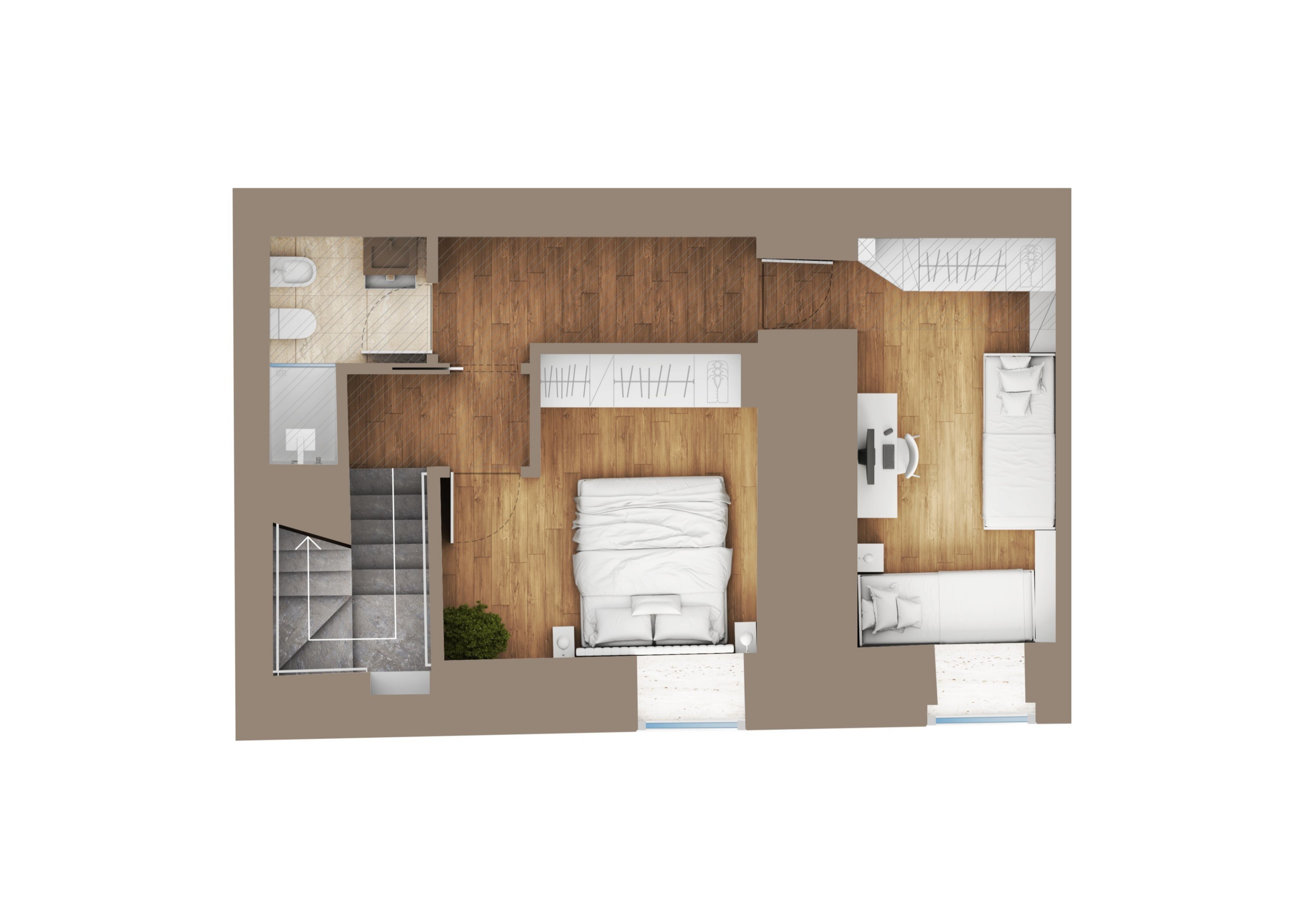 convert this floor plan into a realistic isometric 3d view of a full house show the space from an elevated angle with furniture walls and details visible sfondo bianco use the same furniture as shows on the plan do not change the orientation of the floorplan