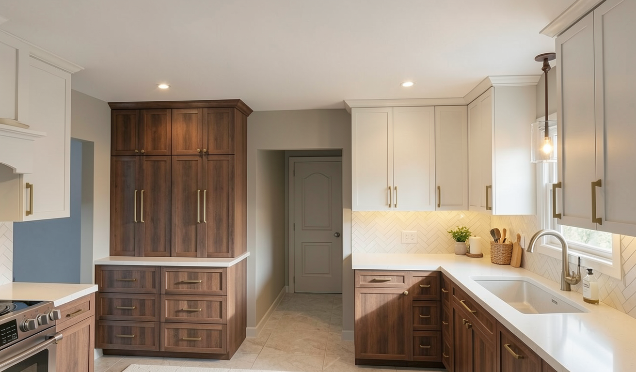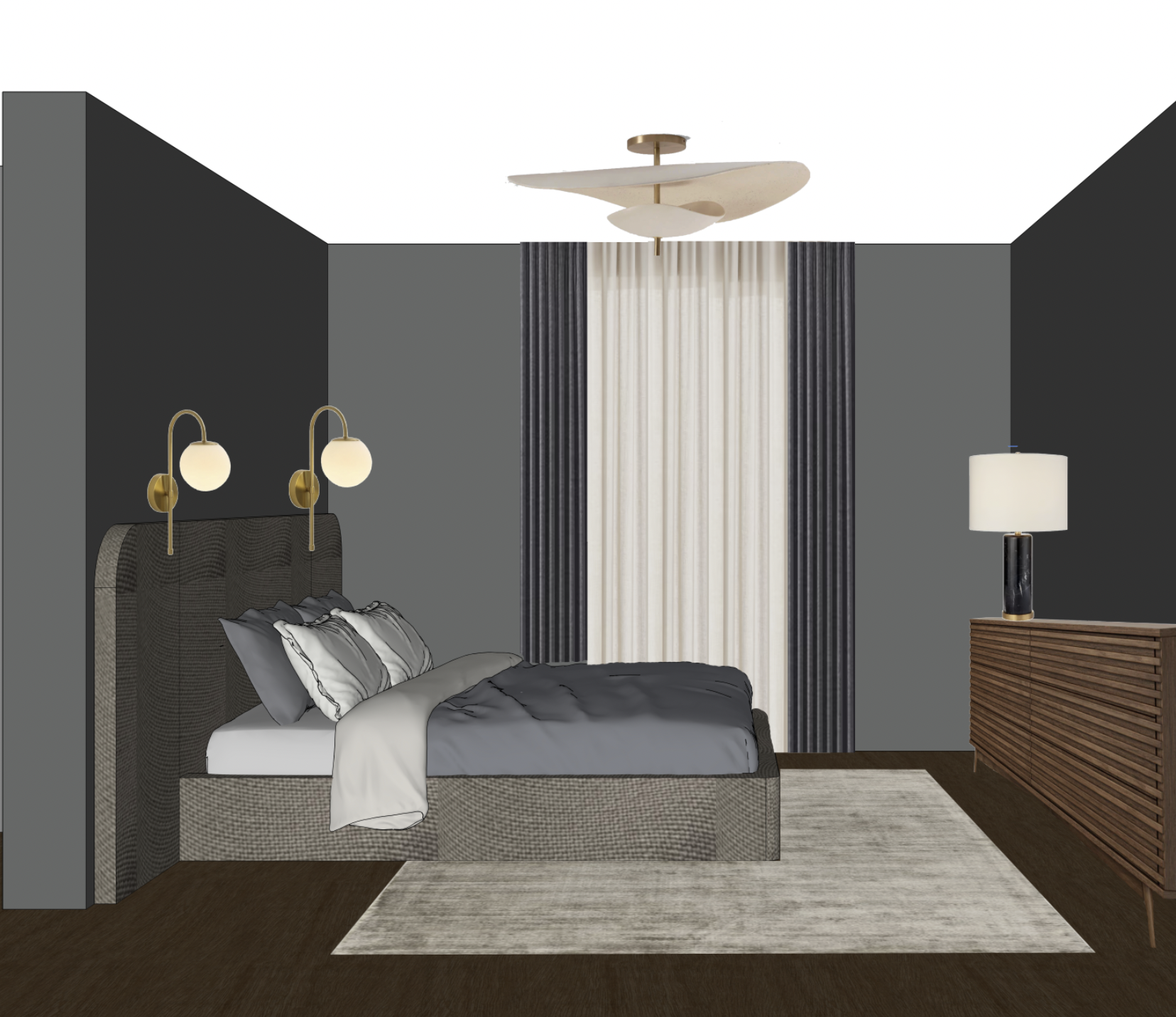 render my image make the bedframe a medium grey linen add light source to wall sconce and ceiling light