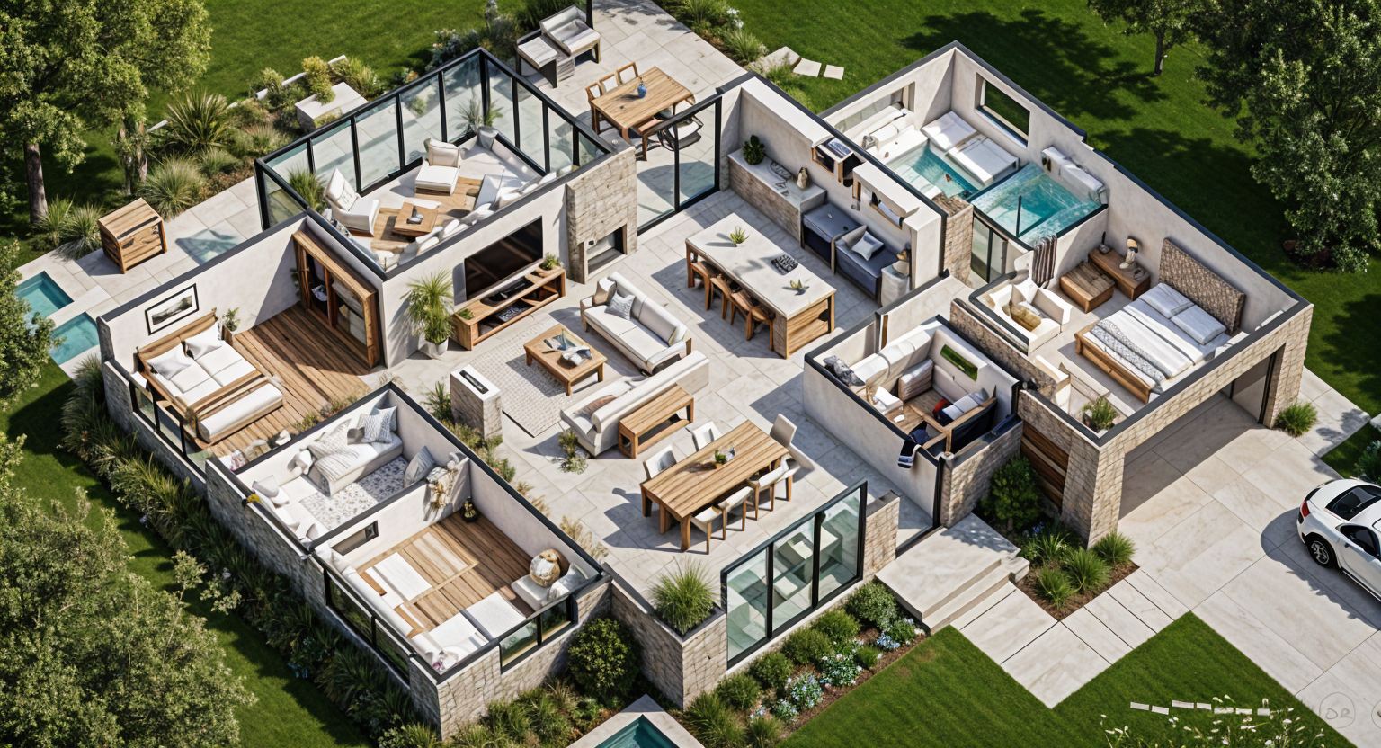 modernist exterior shot please render with medium warm tones architecture