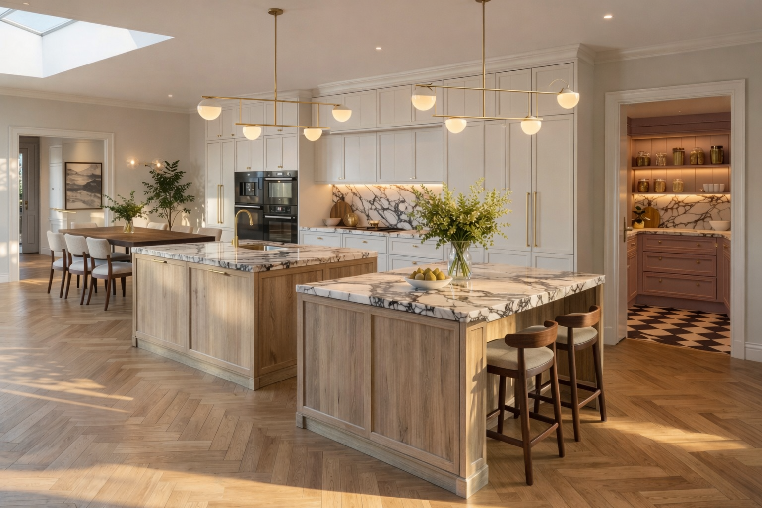 make this image sharper where the cupboards are over the counter remove them and add a shelf in the same marble as the countertop light iy with overhead lighting to match the pendants
