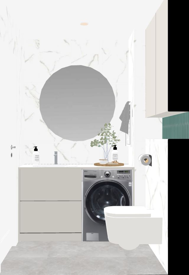 add led light around mirror and under the drawer above the toilet do not change anything there is no window make drawers light beige not grey not wooden in the mirror there are same tiles like above toilet on the whole wall