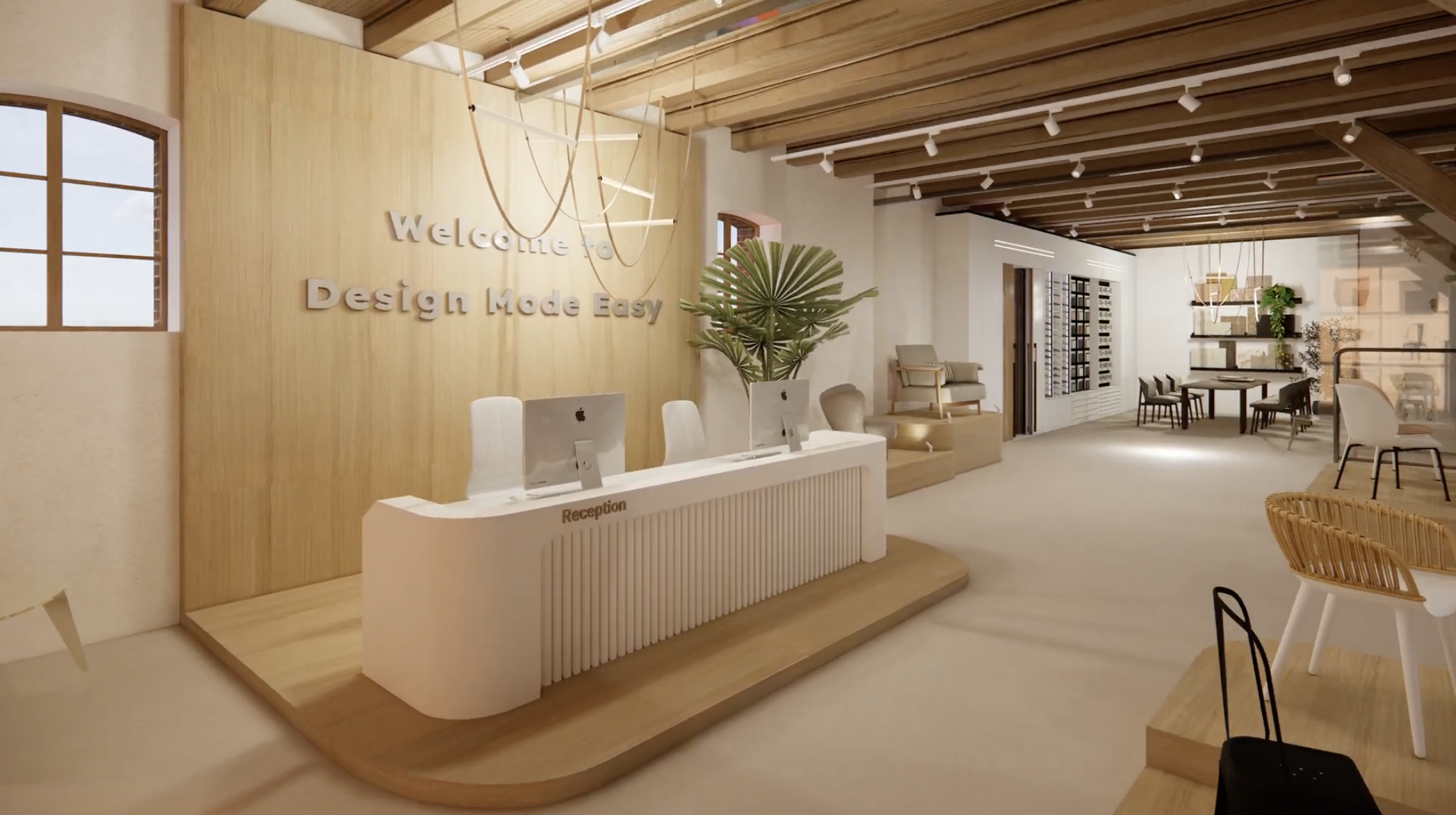 urob z tejto vizualizacie fotku uprav textury svetlo materialy aby to vyzeralo ako fotografia toho priestoru podlaha ostava svetly vinyl ako na obrazku zmen aj priestor a cely dizjan priestoru na dizajnovu modernu predajnu posteli s dizajnovymi aj farebnymi postelami