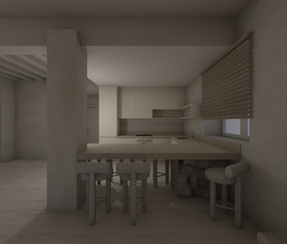 create a highly realistic render of a modern kitchen in a coastal home with a calm warm and refined atmosphere the design is minimal and cohesive inspired by seaside living with a soft neutral palette that evokes natural light sand tones and a relaxed elegance the kitchen layout is linear with an l shaped extension featuring clean handle less cabinetry in a light beige tone with a matte finish the surfaces appear smooth and seamless the countertop and backsplash are in a natural light beige stone reminiscent of sand and coastal textures with subtle variations and a soft matte finish a hidden led strip is installed beneath the upper cabinets providing soft indirect lighting that gently illuminates the backsplash and enhances the warm ambient atmosphere in the foreground there is an extended kitchen island or bar with a monolithic appearance in the same light beige stone material in front of the island there are bar stools with light oak wooden legs and a natural finish the seats are upholstered in a soft light beige linen fabric adding a breathable coastal character at the back a window allows soft natural light to enter the space filtered through a light fabric vertical blind wood reinforcing the relaxed seaside feeling the walls are finished in light beige microcement and the flooring is in a light natural tone enhancing the airy and serene coastal atmosphere the overall lighting is soft and diffused combining natural light with hidden led lighting creating minimal shadows and a warm inviting high end coastal ambiance ultra realistic render high resolution premium materials coastal interior design interior design magazine photography style