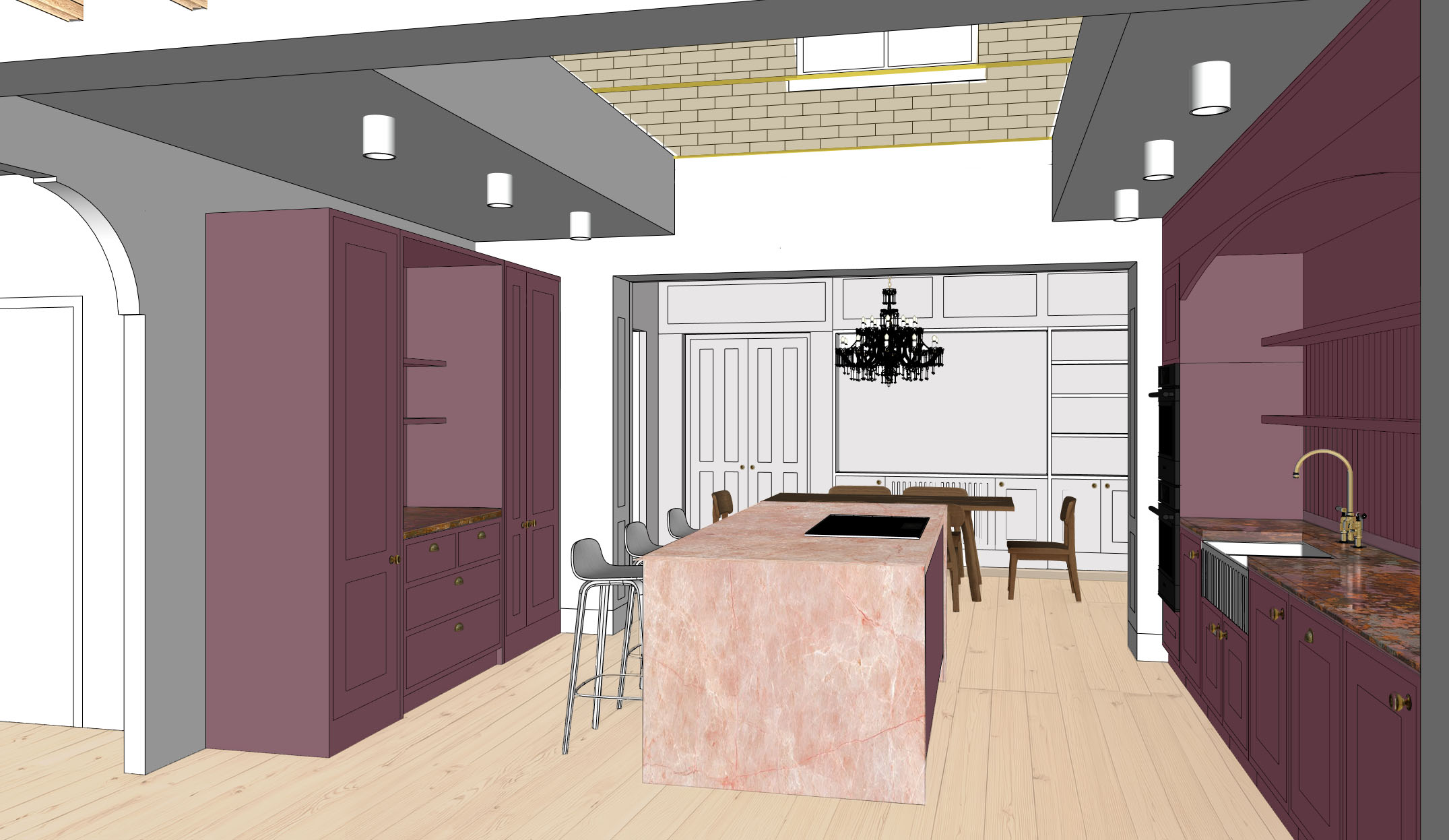 create a beautifully rendered modern interior kitchen scene the dining area features a light oak table with matching chairs in warm oak tones a luxurious bronze crystal chandelier hangs in the background casting a soft glow the kitchen area showcases deep plum brown cabinets with brass handles complemented by a patinated copper countertop the kitchen island crafted in elegant pink marble pairs with sleek silver metal bar stools walls to the dining area are adorned in crisp light grey panels and bookshelves the atmosphere is cozy yet sophisticated blending modern elegance with classic charm a rooflight over the kitchen island brings natural daylight from above and is framed in minimal brass framing