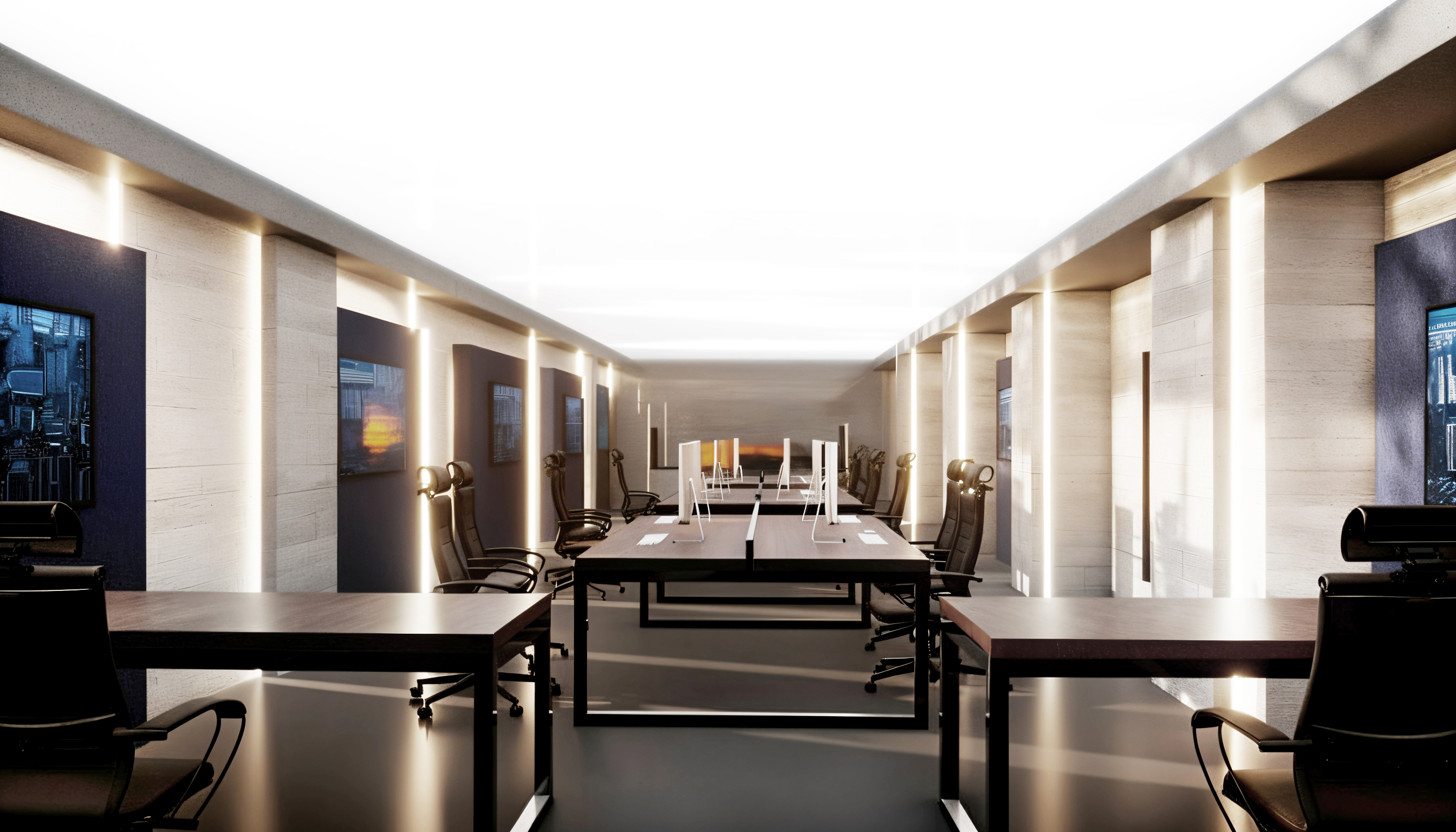 change the desk to wood and change the photos on tv to a navy militaire subject make the wall light gray and keep the blue panels change the picture of the computer to militaire subject make the ceiling white keep the vertical linear elements as they are and put some glow light keep the glass at the end of the room that divide the space