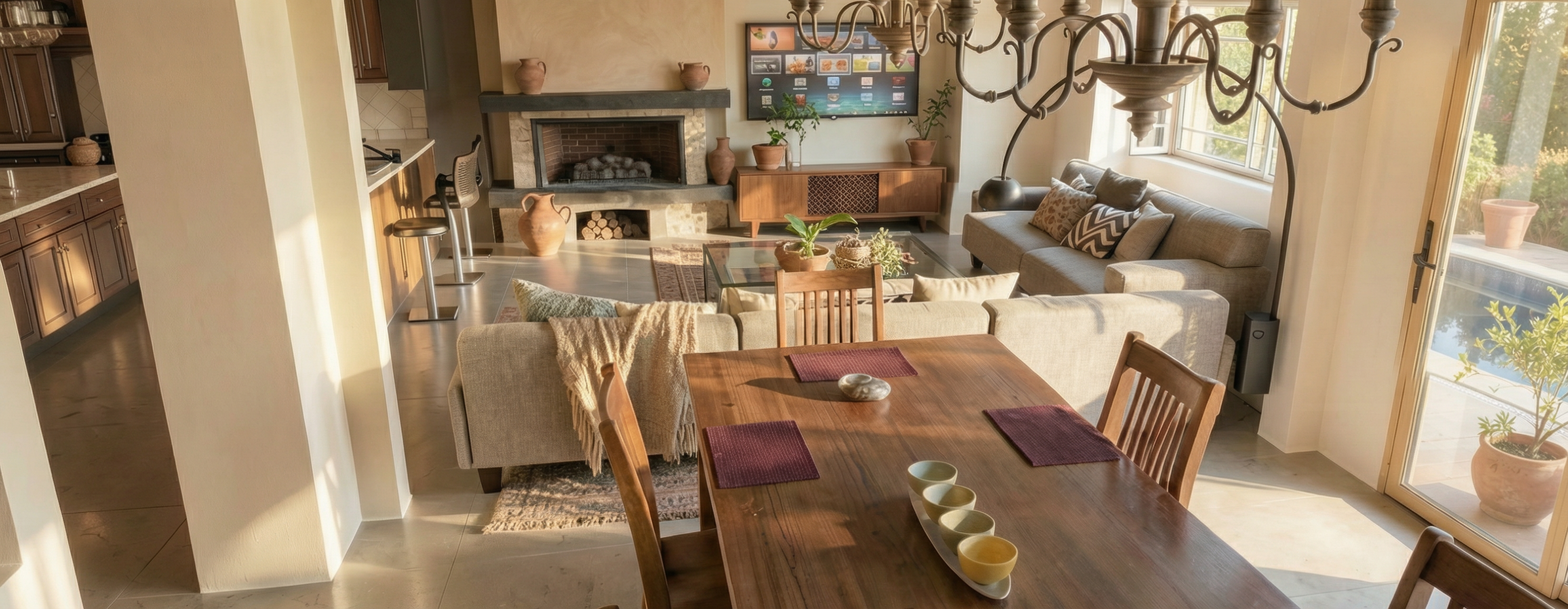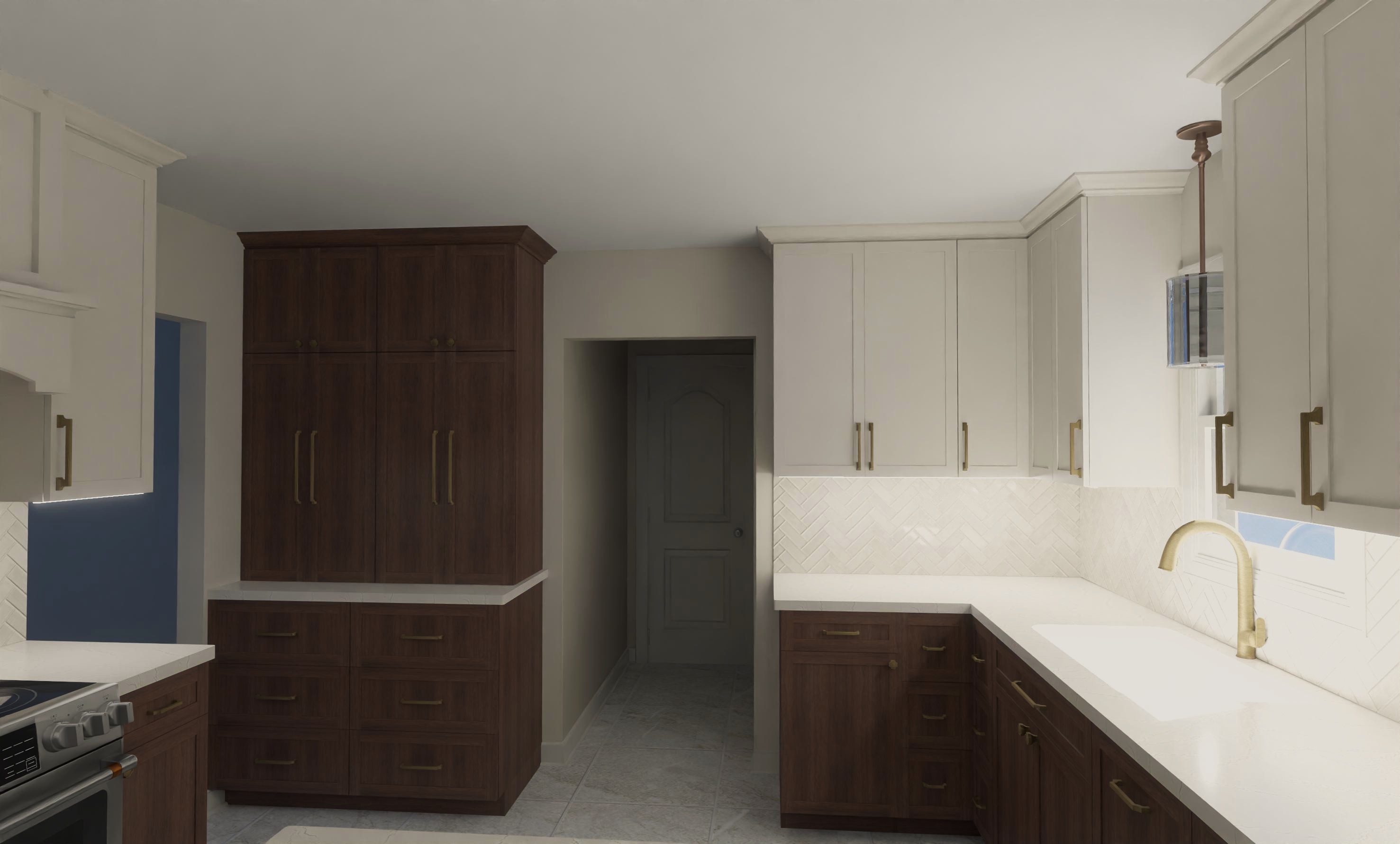 lightly accessorize this kitchen keeping counter tops fairly clear make the lights above the island appear on and keep the white herringbone backsplash and do not change the hutch or lighting shape maintain the color of the wood do not use a yellow lighting hue