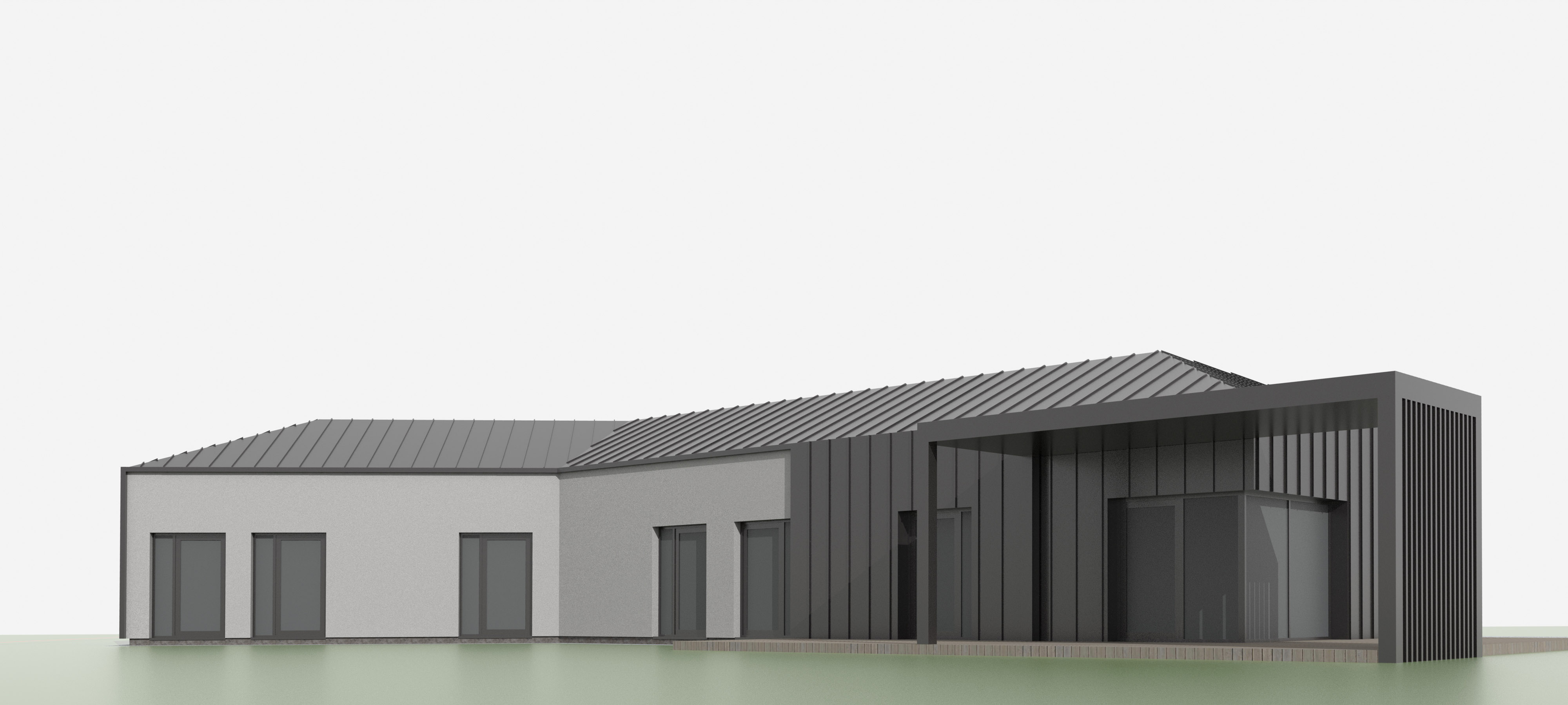 render a modern architectural building with a sleek linear design feature a structure with a charcoal gray metal roof and facade with segments of light grey plaster creating a minimalist aesthetic the roof and walls reflect a glossy black that contrasts with the light gray paving and gravel driveway the area around the building is covered in lush green grass cloudy summer sky with fields and shrubs on the horrizon and metal dark grey fence behind the building set the scene in a clear bright atmosphere with soft sunlight casting gentle shadows enhancing the building s modern elegance make windows transparent