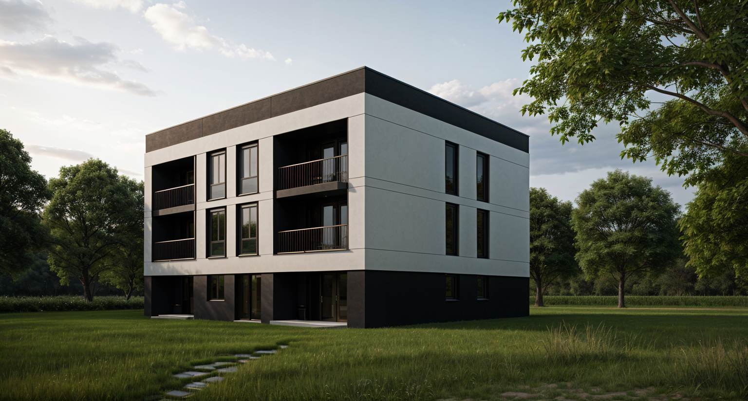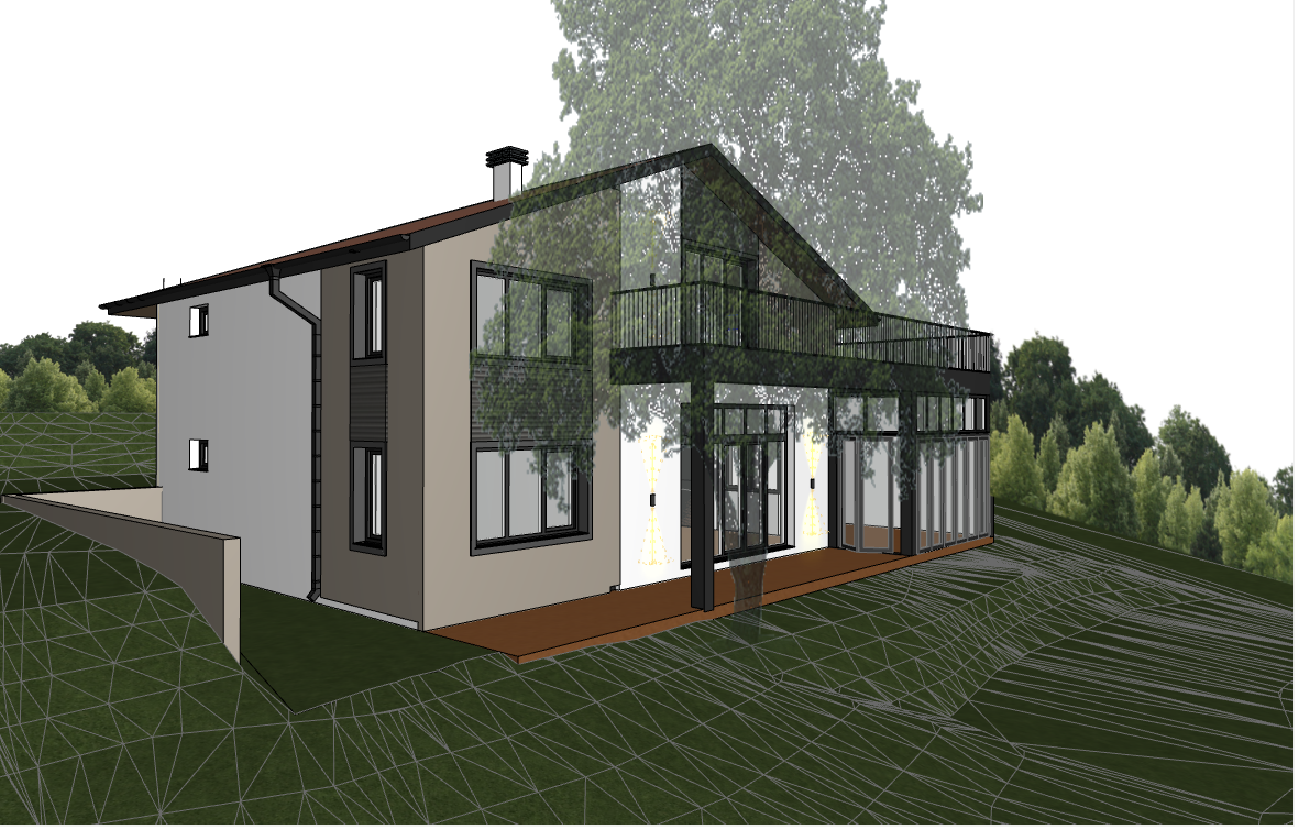 modern architectural house nestled in a serene landscape sleek dark gray exterior with large glass windows warm wooden accents on the roof and balcony surrounded by lush green trees use vibrant green for the grass and trees bright whites and soft grays for the interior add soft ambient lighting for a peaceful and inviting atmosphere