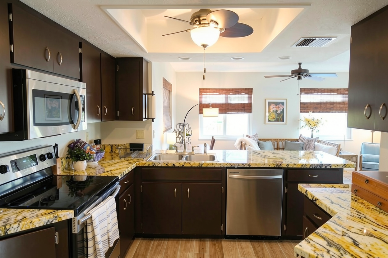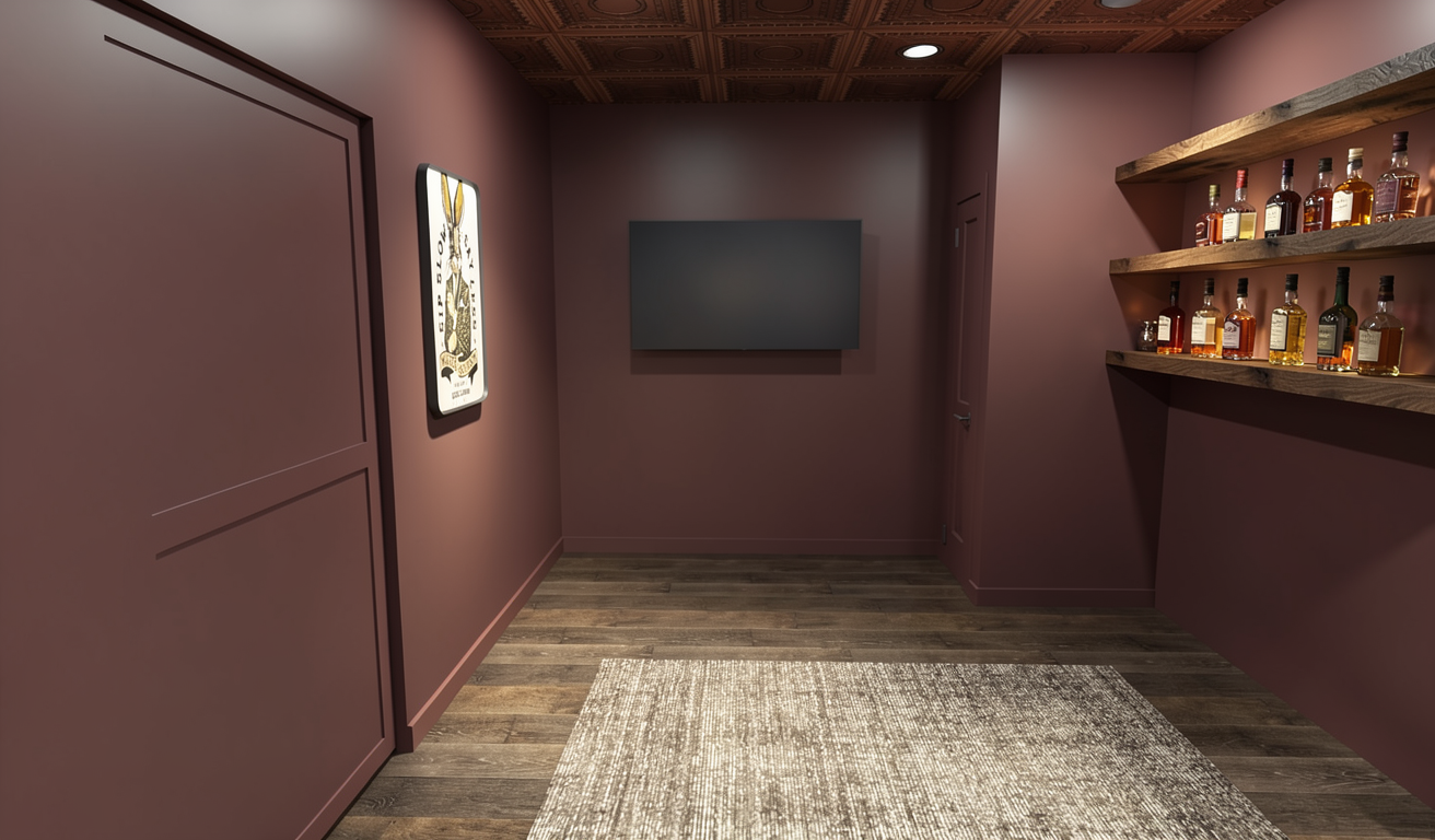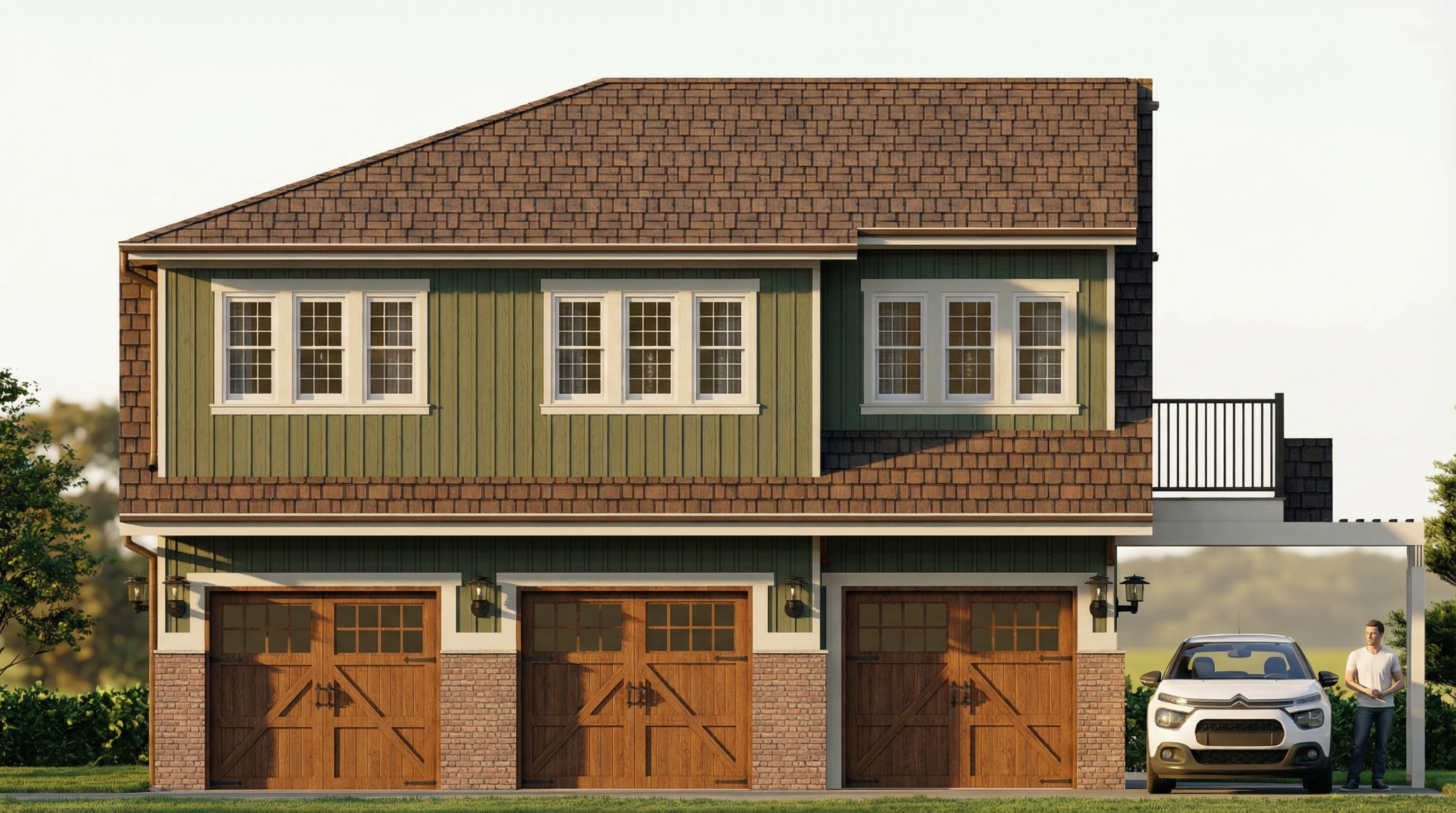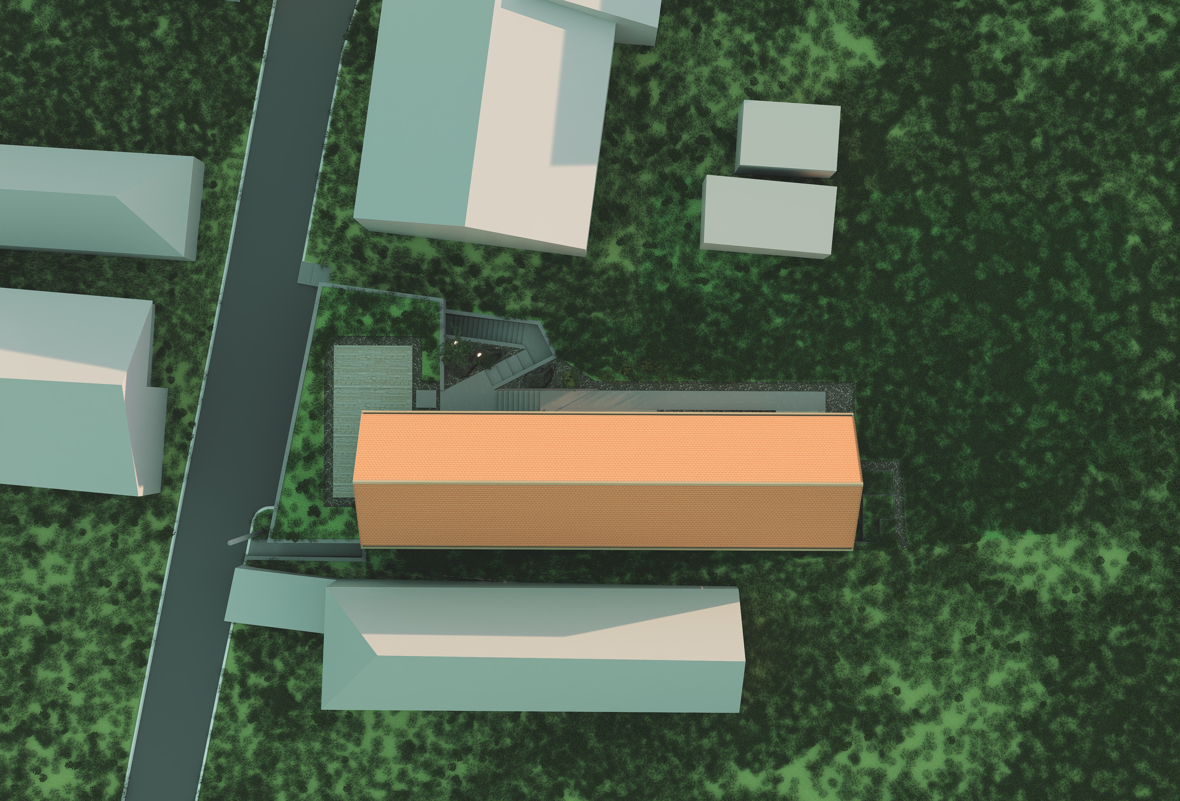 create a photorealistic architectural visualization of the provided scene from an elevated aerial viewpoint preserve all original materials colors lighting fog and the overall atmosphere of the scene exactly as they are geometry lock the original geometry proportions dimensions and spatial layout of the entire model must remain completely unchanged do not modify deform simplify smooth rebuild or redesign any architectural elements including stairs roofs walls openings or details enhance the composition by adding realistic trees distributed naturally across the scene including the foreground midground and background not only in the front trees should be well scaled and integrated without altering the original design intent or geometry maintain high material accuracy realistic light behavior in fog soft shadows and a professional architectural visualization style do not change the mood weather conditions or environmental atmosphere of the scene
