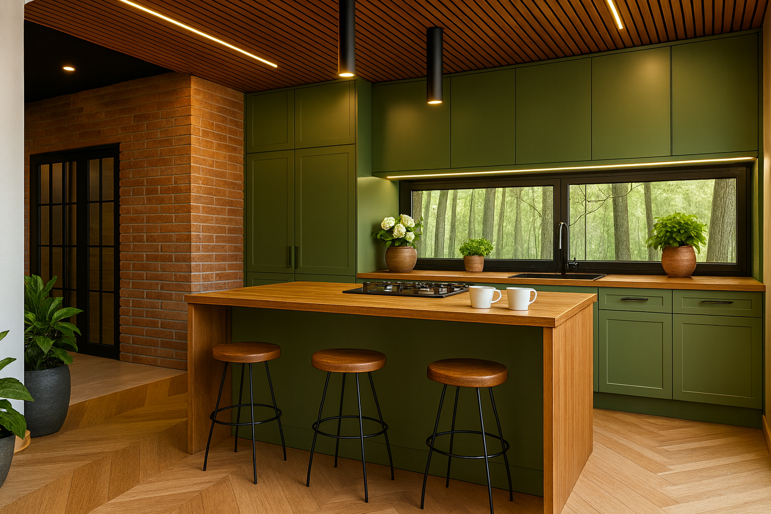 ultra photorealistic interior photograph of a modern kitchen with natural oak wood and olive green cabinetry maintain the exact layout proportions and camera angle from the reference image scene setup minimalist loft style kitchen with brick wall on the left vertical wooden slatted ceiling with linear led lights matte black window frame opening to a forest view and a central island with integrated cooktop and three wooden stools lighting balanced daylight entering softly through the large window overcast forest light warm 3000 k led accent lighting from ceiling strips and under cabinet lights perfect cinematic balance between warm indoor light and cool natural light from outside gentle bloom around leds and soft reflections on matte surfaces materials textures oak countertop with fine grain satin finish micro scratches and realistic edge reflections olive green cabinet fronts with satin matte surface and subtle sheen variations brick wall with rough micro texture and warm indirect reflections wooden herringbone floor with visible texture and light bounce micro details slight dust on countertop natural imperfections two white ceramic mugs with subtle steam small kitchen accessories wooden cutting board linen towel open cookbook or citrus fruit potted green plants with soft translucency and minor leaf imperfections slight finger marks on handles and soft worn edge on stool seats optics camera professional full frame 35 mm lens f 2 8 iso 100 realistic depth of field gentle bokeh in forest background tonal range hdrx with soft contrast and rich midtones lens effects minimal chromatic aberration micro contrast enhancement no overexposure post processing look warm cinematic editorial color grading lut kodak 2383 balanced highlights lifted shadows realistic material bloom crisp yet natural sharpness with fine film grain magazine print quality overall mood warm natural editorial calm tactile elegant a perfectly lit photograph from a premium interior design magazine