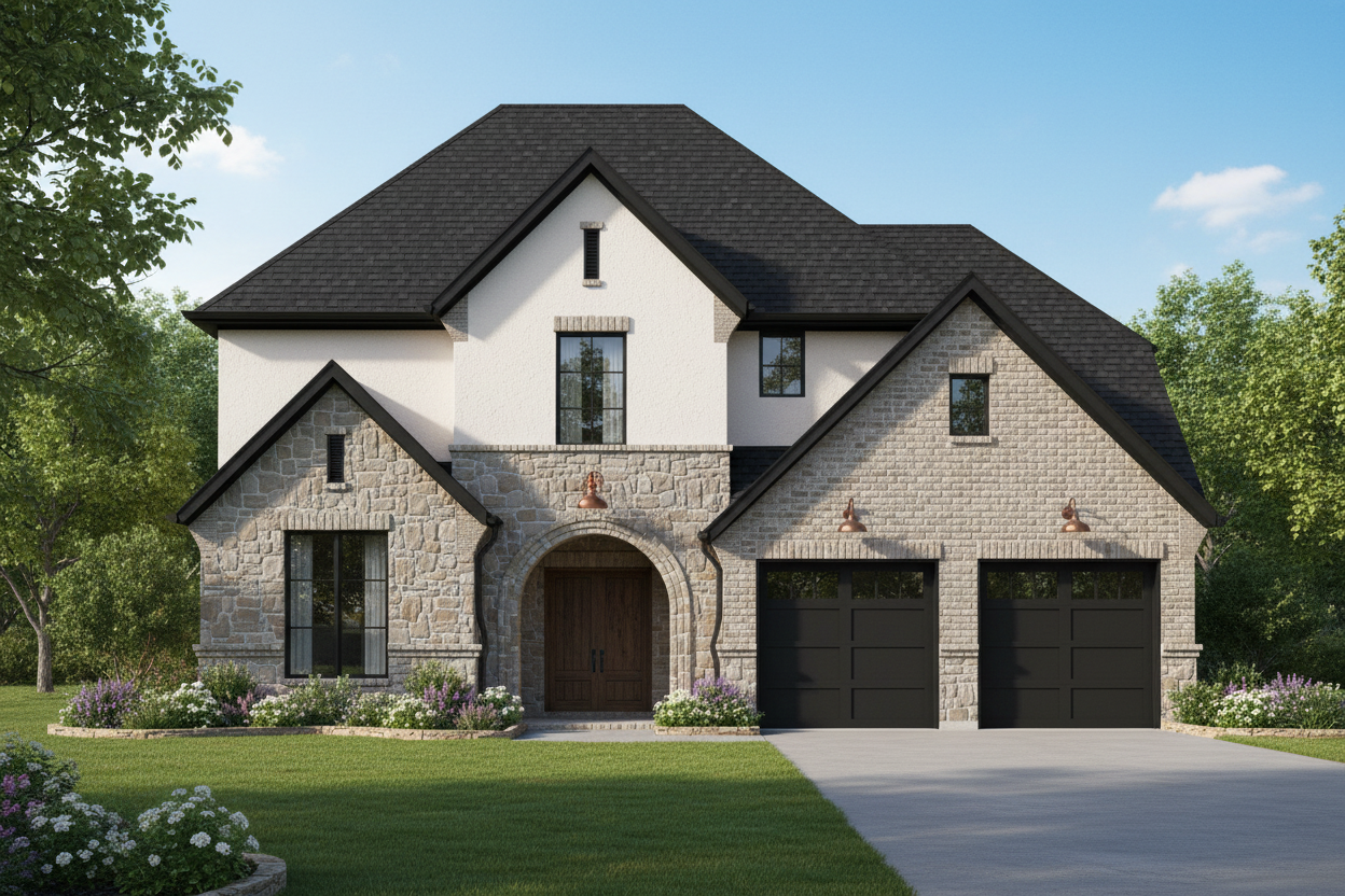 the stucco on the home is an off white the roof color is black and the trim around the roof is balck the garage doors are black the stone is only on the left side garage door and the arched entry way the stone is a sand stone with very light grey and brown coloring the grout is heavy the windows are black and the front door is a stained walnut