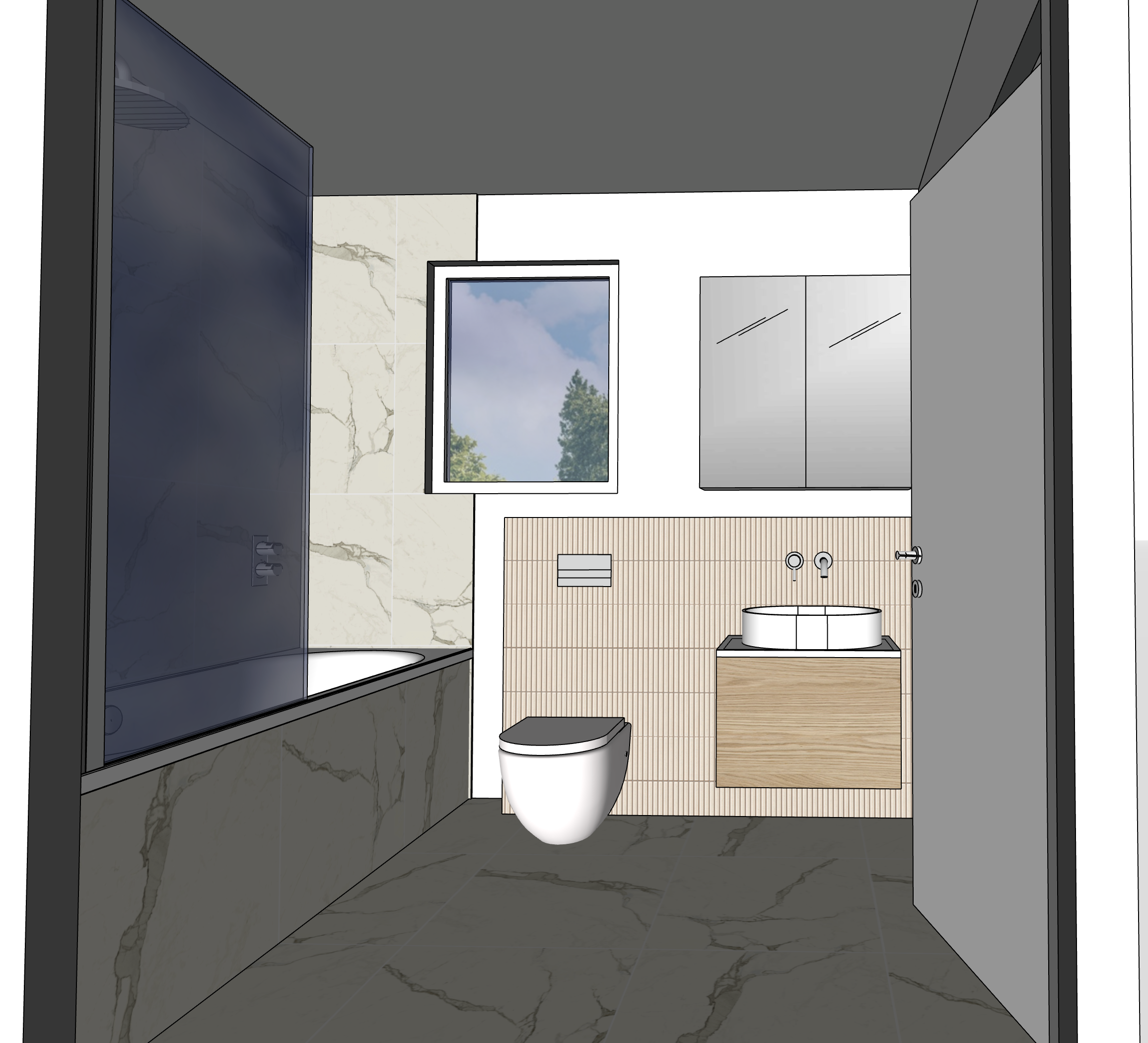 calm and soft natural lighting in this marbled bathroom