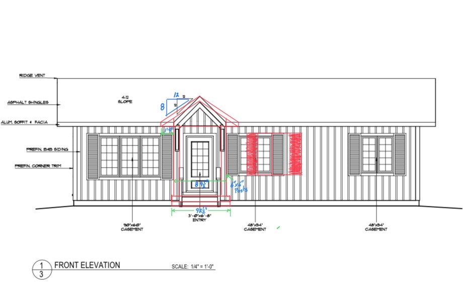 white board and batten vinyl siding yellow front door concrete path to front porch from the left brown roof in a forest