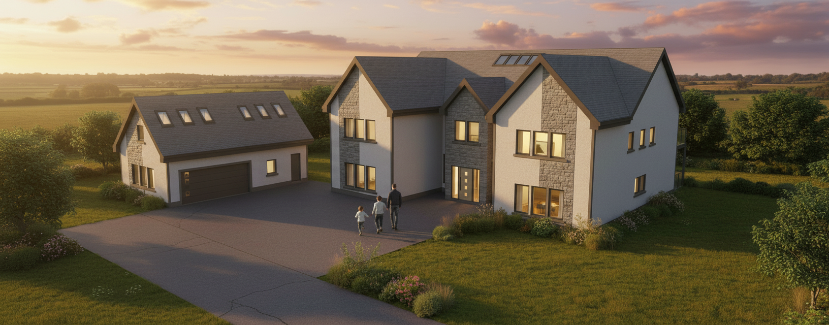 enhance image quality only upscale to 4k resolution preserve the original design exactly as is no changes to geometry materials lighting colors textures composition or camera angle except for the driveway surface change the driveway material to a realistic cream stone chip finish correctly scaled and naturally integrated do not alter the driveway layout size edges or surrounding elements keep all architectural and landscape elements unchanged improve sharpness clarity and detail only photorealistic clean high resolution output
