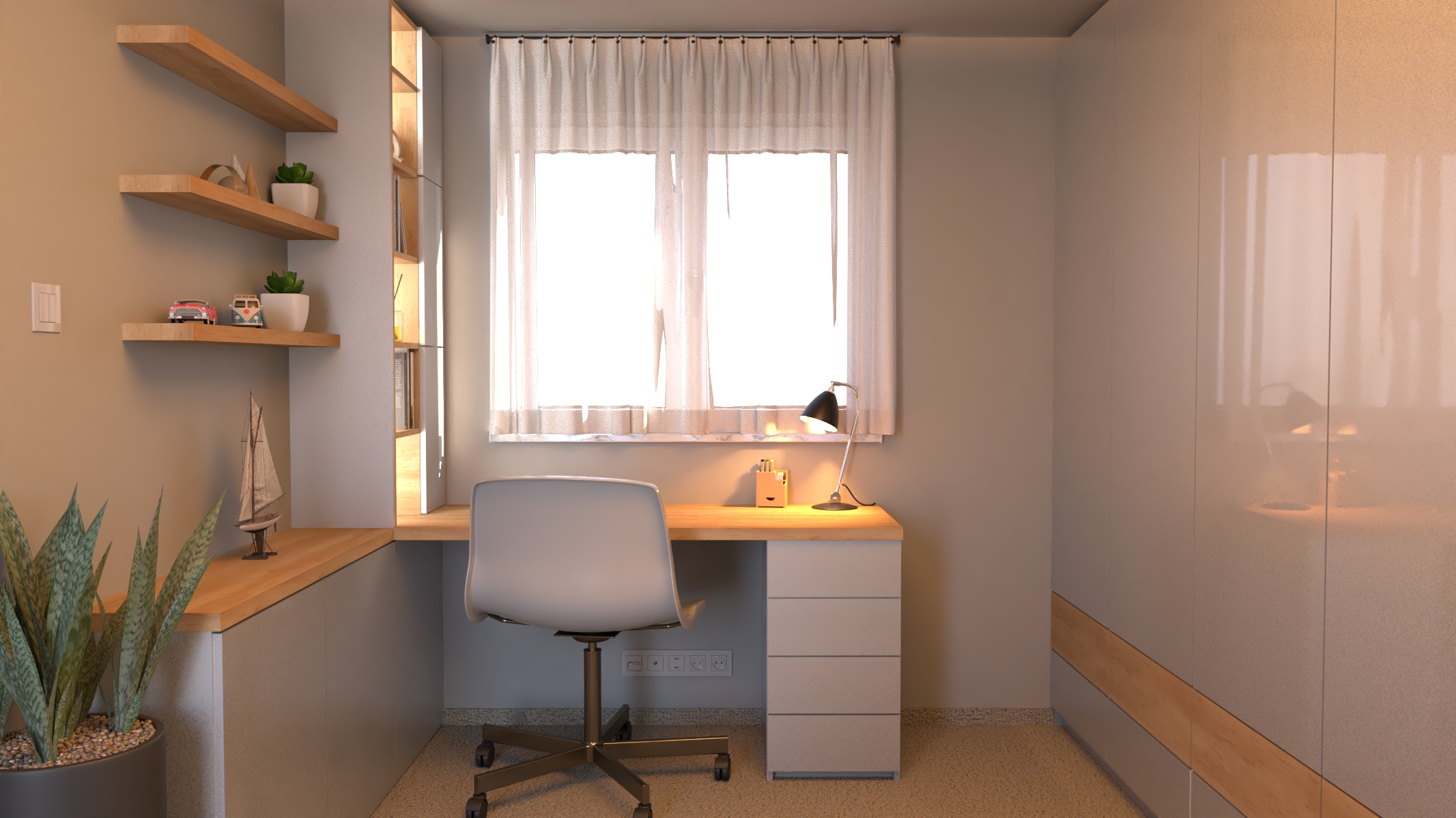 vytvo fotorealistick pohled re ln odpoledn osv tlen stropn bodovky pohled z okna rozmazan na m sto a zachovej dekory na n bytku