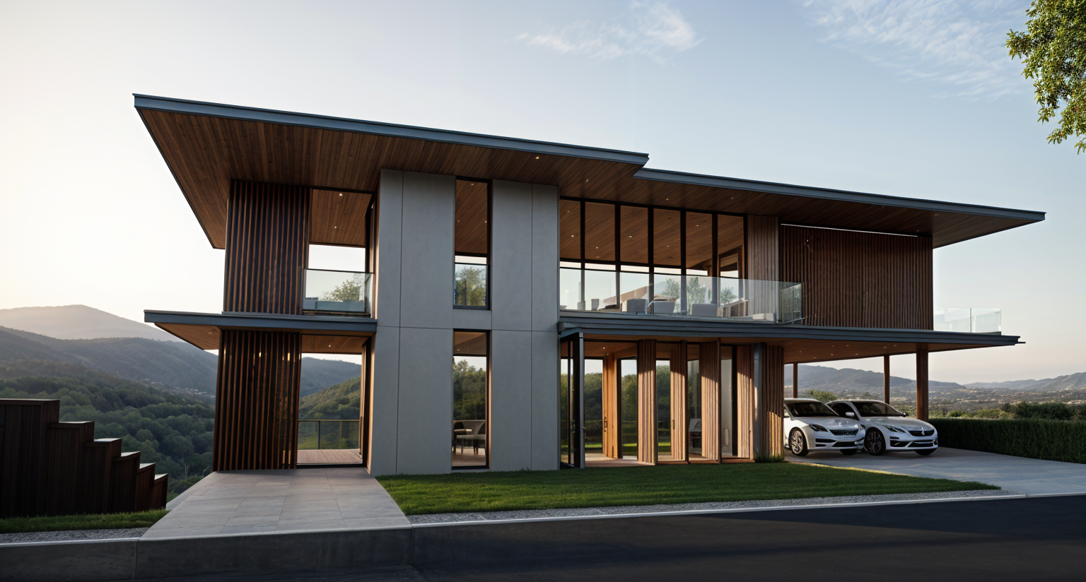 add front yard with landscaping sage green siding black shingles dark grey trim sky background add person at the front door clay color window frame shed roof on bumpouts