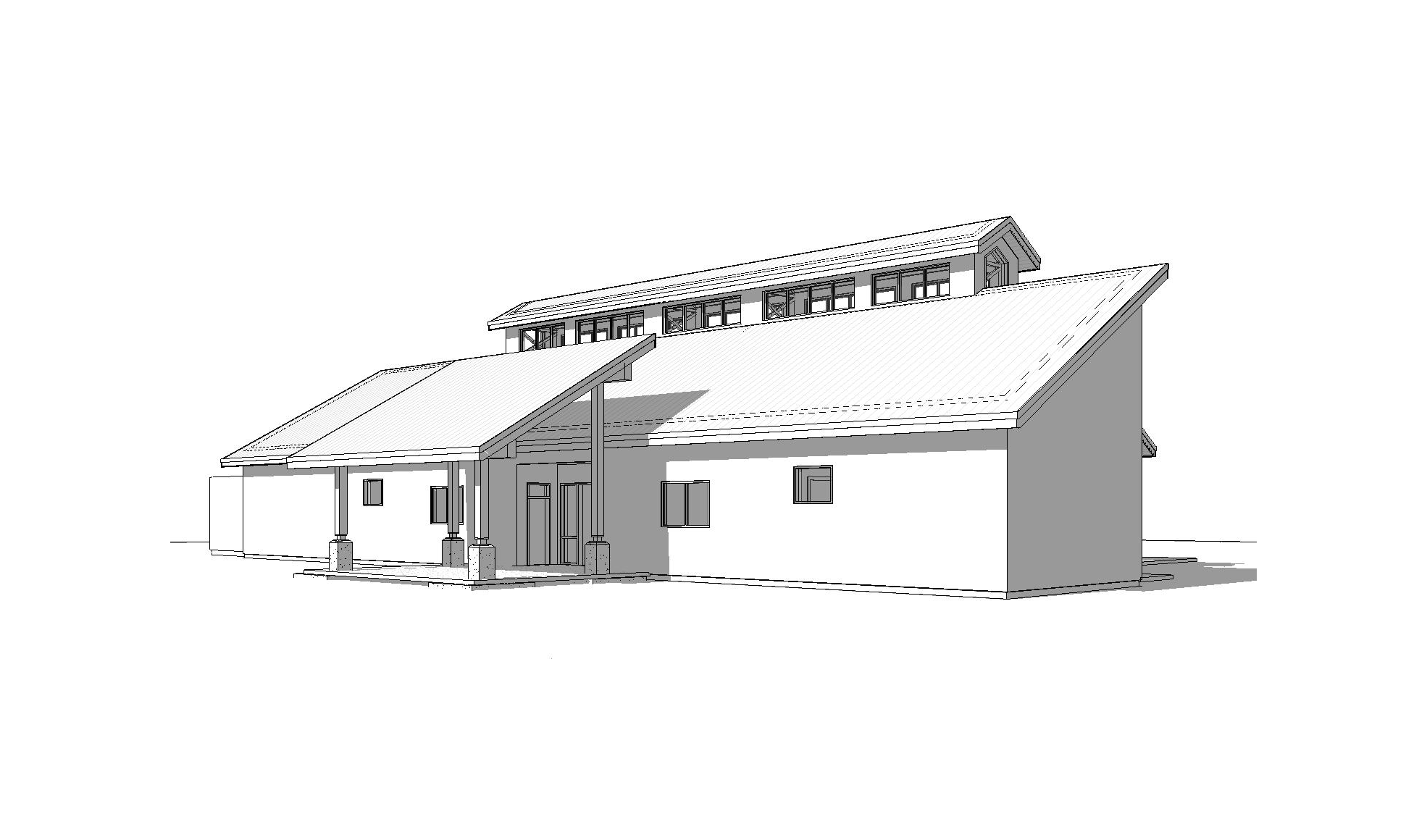 back view of a clean modern architectural exterior rendered in cinematic vibrant golden hour lighting with blue skies mountain modern with heavy timber architectural style natural wood siding beautifully lush green manicured landscape around structure with hedges and gardens black standing seam metal roof prominent cinematic sprawling winery in the far distance with big douglas fir trees surrounding the house in the background with this house in the foreground high fidelity photorealistic visualization crisp shadow falloff refined facade geometry soft atmospheric depth premium architectural photography mood ultra clean composition and materials dark trim around windows big wood truss