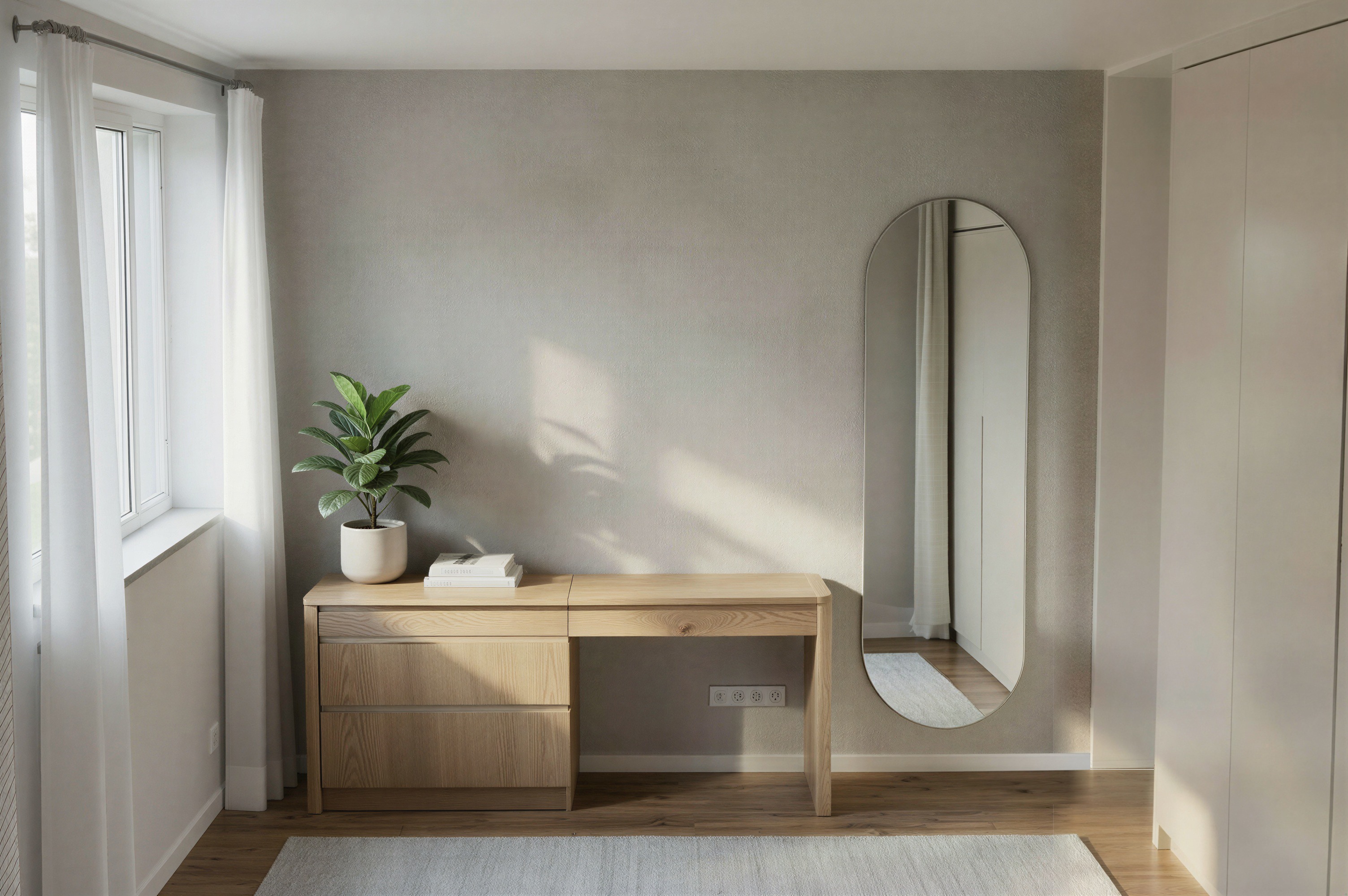 ad light beige decorative wall plaster smooth matte surface with subtle cloudy variations soft concrete like texture fine irregular tonal transitions slightly mottled appearance delicate hand troweled effect minimal roughness no cracks no sharp patterns natural diffuse lighting warm neutral tones elegant modern interior finish micro texture visible but very soft seamless wall surface change the mirror reflection to be more blured and its not clear what is behind
