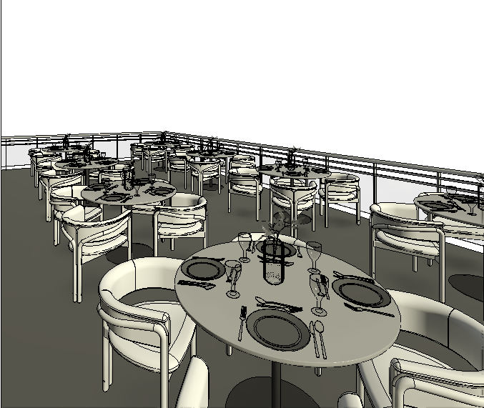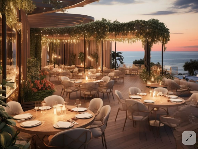 exterior shot render prompt create a hyperrealistic rendering of a luxury rooftop restaurant based on the provided 3d model maintain the exact camera angle layout and furniture placement location view set the scene in chicago with a visible skyline in the background including soft focus high rise buildings and hints of lake michigan time of day should be golden hour transitioning into sunset with warm tones in the sky soft orange pink and blue gradient lighting use a layered lighting approach warm ambient sunset light coming from the horizon soft led accent lighting integrated under railings and architectural edges tabletop lighting candles or small warm lamps on every table subtle string lights or fairy lights above or along pergola structure for atmosphere ensure lighting is warm but balanced avoid overly yellow tone materials finishes flooring light natural wood decking slightly matte realistic grain tables round light wood tables with clean edges chairs upholstered dining chairs in soft beige fabric with subtle texture light wood or metal legs railings slim black or dark metal with glass panels for unobstructed view add greenery planters with lush plants soft cascading vines and small floral accents furniture styling tables fully set plates cutlery wine glasses folded napkins add small centerpieces minimal flowers or candles keep layout identical to model round tables grouped evenly atmosphere details add slight depth of field for realism soft reflections on glassware light breeze feeling slight movement in plants optional a few subtle silhouettes of people seated to add life not too busy mood upscale romantic rooftop dining experience warm inviting elegant and slightly modern rendering style ultra realistic high detail soft shadows global illumination cinematic lighting 4k quality