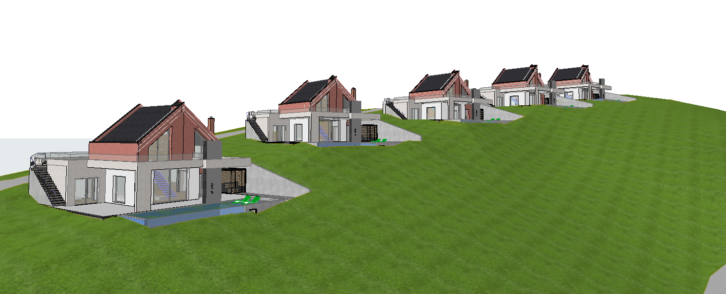 exterior shot these are some villas designed in a mountainous terrain the villas have red brick facades and the roof is made of sheet metal put some greenery the greenery and trees should look more real and the render should not look dry the render should not be warm colors but the ambient light should be brighter and be realized during the day the render should not look like a drawing but realistic don t change the villas to be as they were designed the facade should be made of red bricks don t change the villas just the environment put a tree in the environment so it doesn t look empty don t change the terrain put real green grass and add some trees to the environment architecture