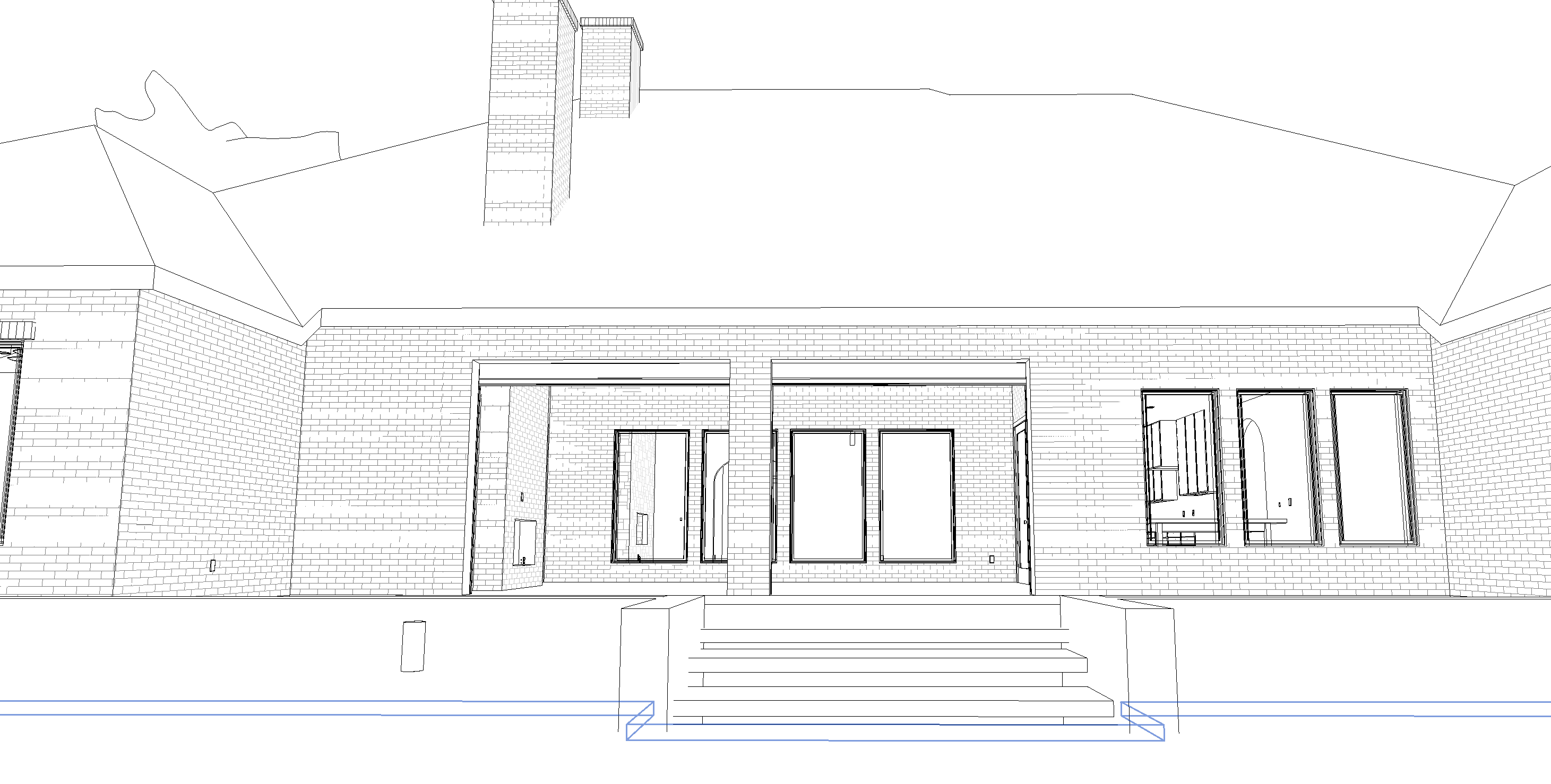 dark red and brown bricks black windows black roof black trim travertine retaining wall and deck over casted day warm lights wet deck swiming pool