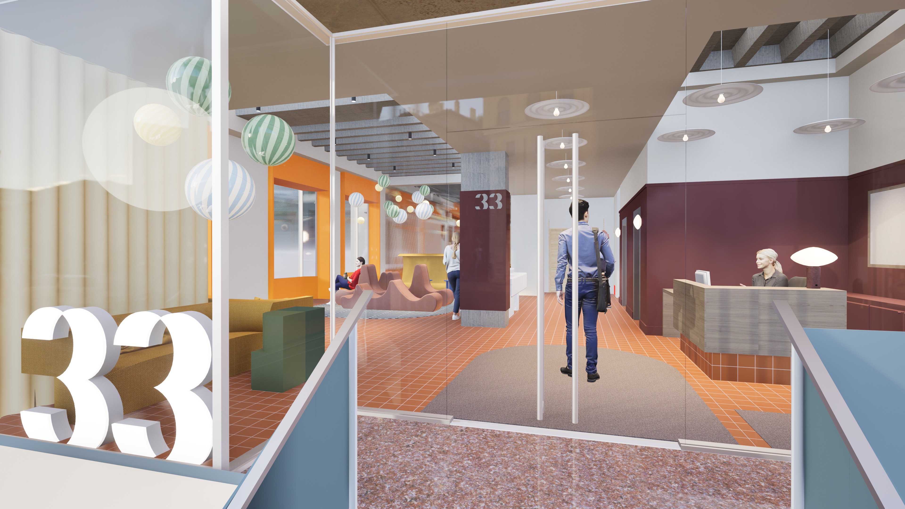 entrance to office building lobby maintain colours and architectural elements enhance realism