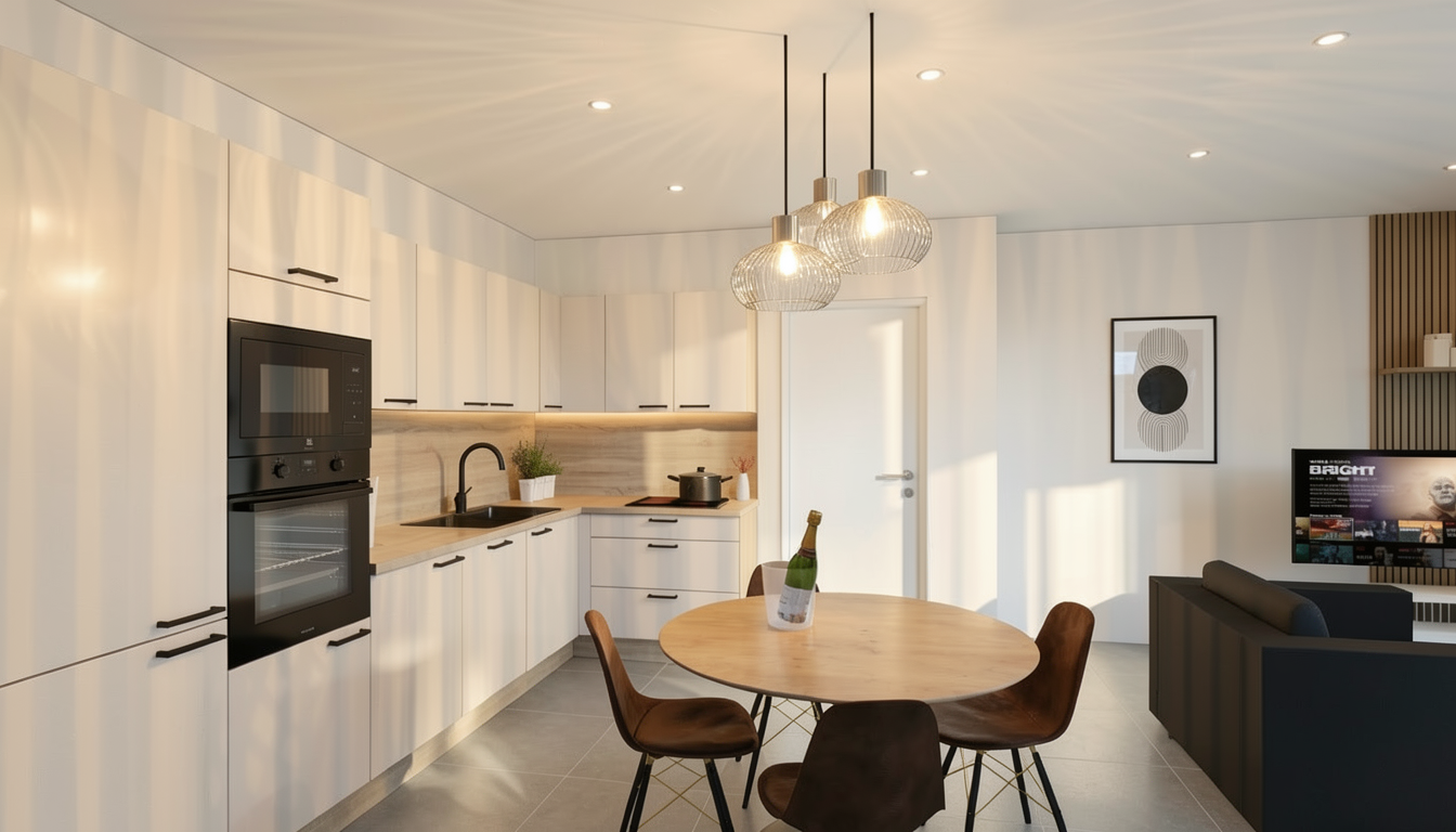 make upper cabinets the same color as the perimeter bottom cabinets make the windows on the west wall shorter so they are the same height as the windows on the north wall add natural tan bamboo roman shades to all windows add trim along the entire perimeter of the ceiling color drench all trim to match the walls keep the island the same color as the rendering keep the bench as is but update the pattern of the cushion to a pale yellow and bright blue animal inspired pattern along with 1 2 pillows slightly update the stools to a total of three style counter stools with a rounded back two stools should be opposite the fruit bowl and one stool should be perpendicular to them update the faucet to a satin nickel finish add two teardrop oval shaped glass pendants above the island add recessed cans around the space about 2 feet in from the perimeter of the room make the entire backsplash a glossy square white tile in varying shades of white add a glass door with mullions into the doorway cutout on the left add a wooden door with a raised panel front to the doorway cutout that leads to the garage near to the fridge put an oval doormat in front of this door add a black and white dishcloth into the space and update the fruit bowl to a larger one