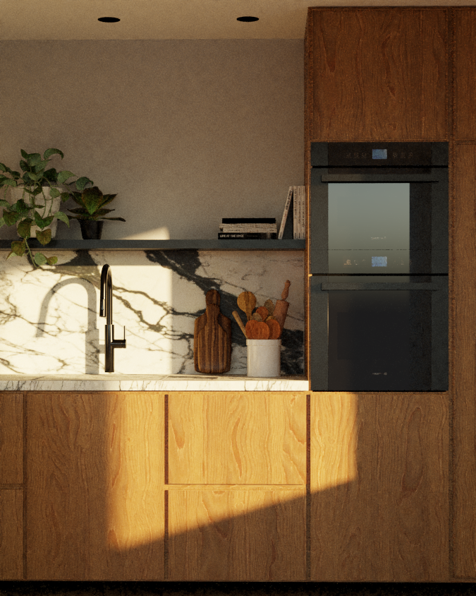 ultra realistic editorial render transform the image into a highly realistic high end editorial photograph preserve the original composition camera angle and design core improvements enhance all materials to feel natural and tactile avoid plastic or flat appearance improve texture definition wood grain stone fabrics metals glass add subtle imperfections tonal variation and depth to all surfaces lighting refine lighting to be natural and believable balanced contrast soft falloff no artificial glow consistent color temperature across the scene geometry detail improve edge definition while slightly softening sharp cgi edges refine small elements and object details for clarity and realism shadows depth stronger contact shadows and ambient occlusion add depth and separation between objects overall realism remove noise and artificial look avoid overly perfect or uniform surfaces ensure all materials respond correctly to light final look clean warm tactile photographic realism with a refined editorial aesthetic introduce chicken cooking in the oven