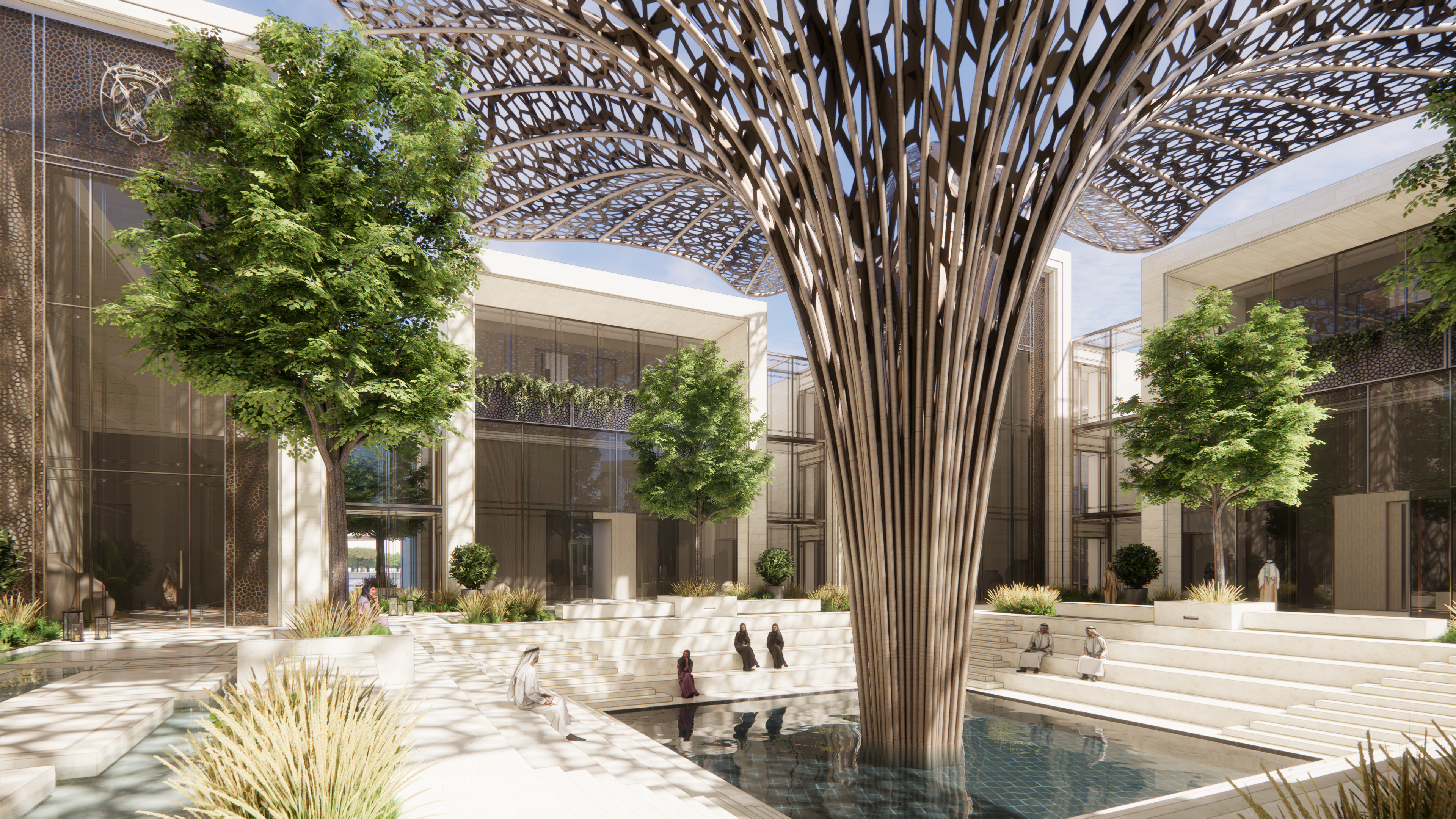 exterior shot a serene architectural courtyard bathed in soft sunlight featuring a grand intricate lattice structure in warm bronze tones surrounding buildings are modern with light cream stone facades large glass windows reflecting the sky lush green trees and plants add vitality casting soft shadows on the ground the tranquil pool mirrors the architecture and greenery with a clear blue surface the atmosphere is peaceful and sophisticated embodying a blend of nature and modernism